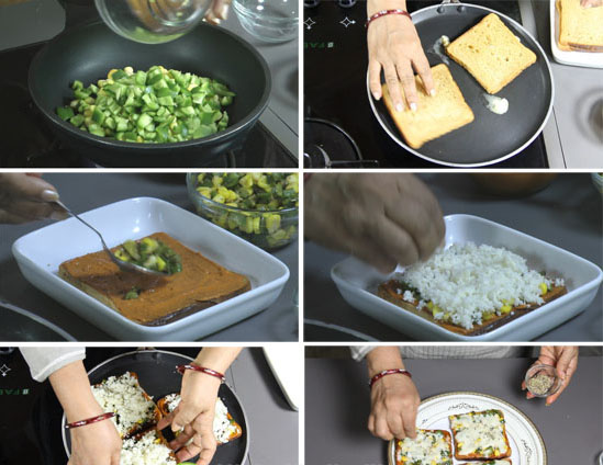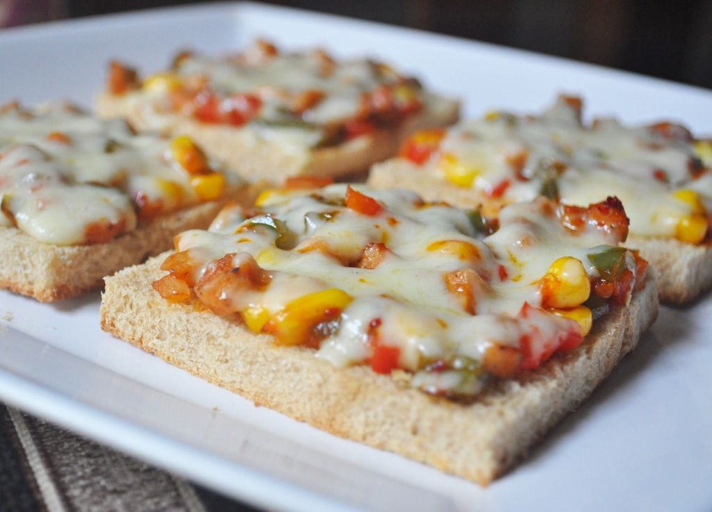 - Give a layer of tomato sauce over the bread. Arrange on the frozen meat, capsicum, dried chilli powder, little onion and chili powder and cheese. Then bake at 180 degrees Centigrade until 10 minutes or until the cheese melts.