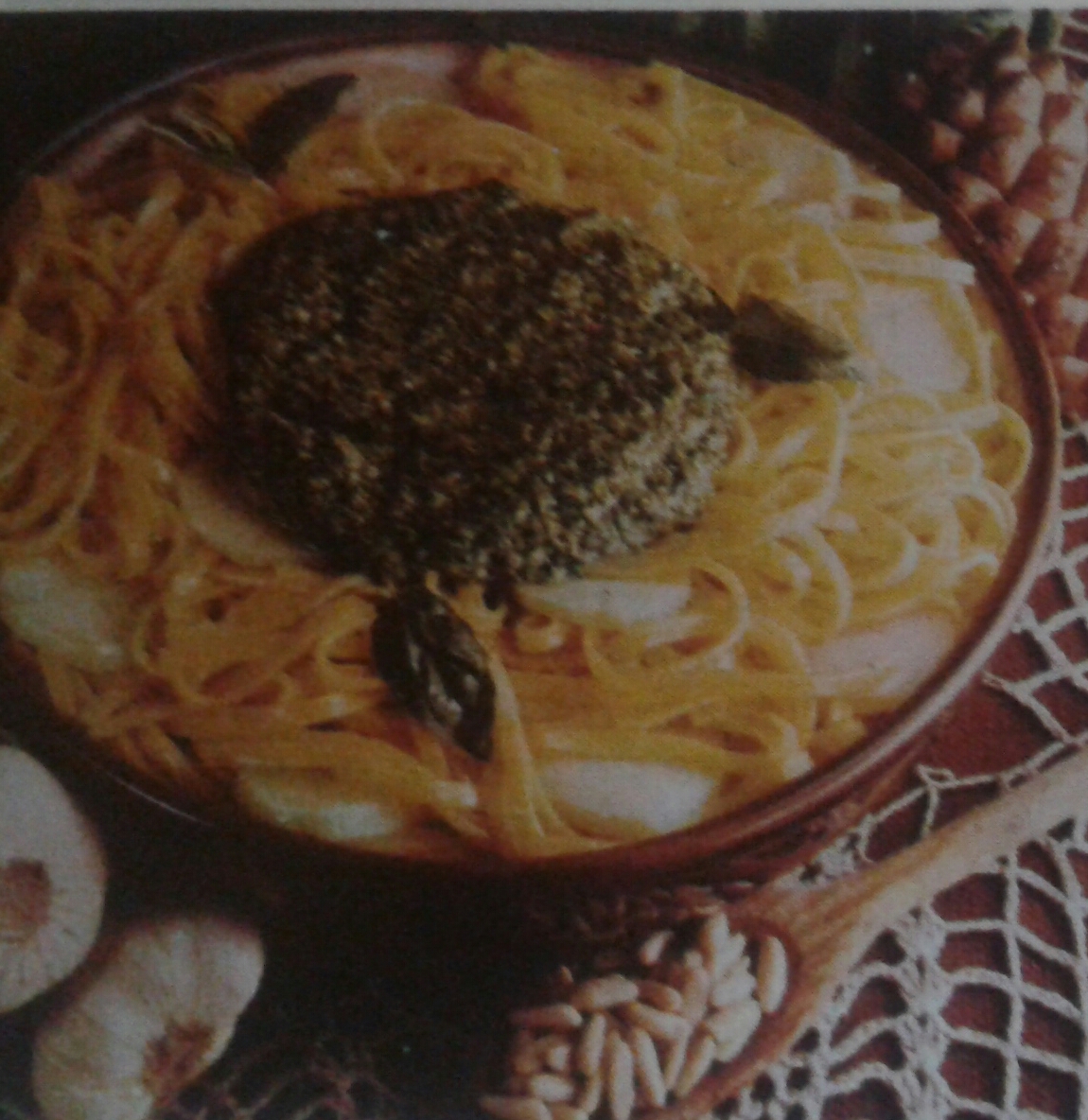 Cook the noodles following the package instructions, in plenty of salt water, until tender and firm (al dente). Meanwhile, in a mortar, mix the garlic, basil, cheese, nuts and salt, mashing and adding oil to form a soft paste. Arrange the noodles in a dish, with the sauce in the center and the slices of potatoes adorning the edges. If desired, spray everything with melted butter.