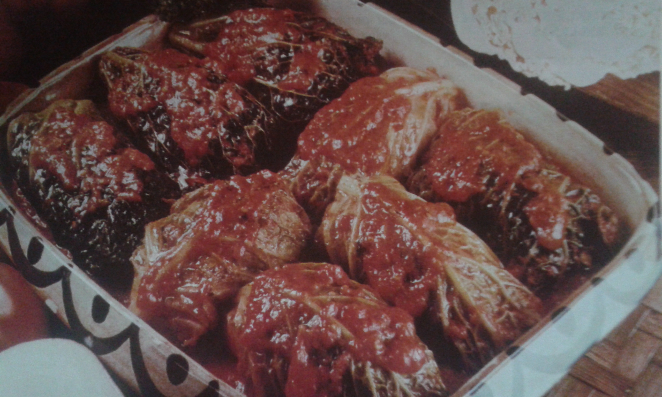 To fill the sheets, place about 3 or 4 tablespoons of filling in the center of each sheet; fold the edges of it over the center. Place each filled cabbage in a heat-resistant mold; pour the tomato sauce on top and put the mold to bake about 40 minutes at moderate heat. Serve this dish very hot.