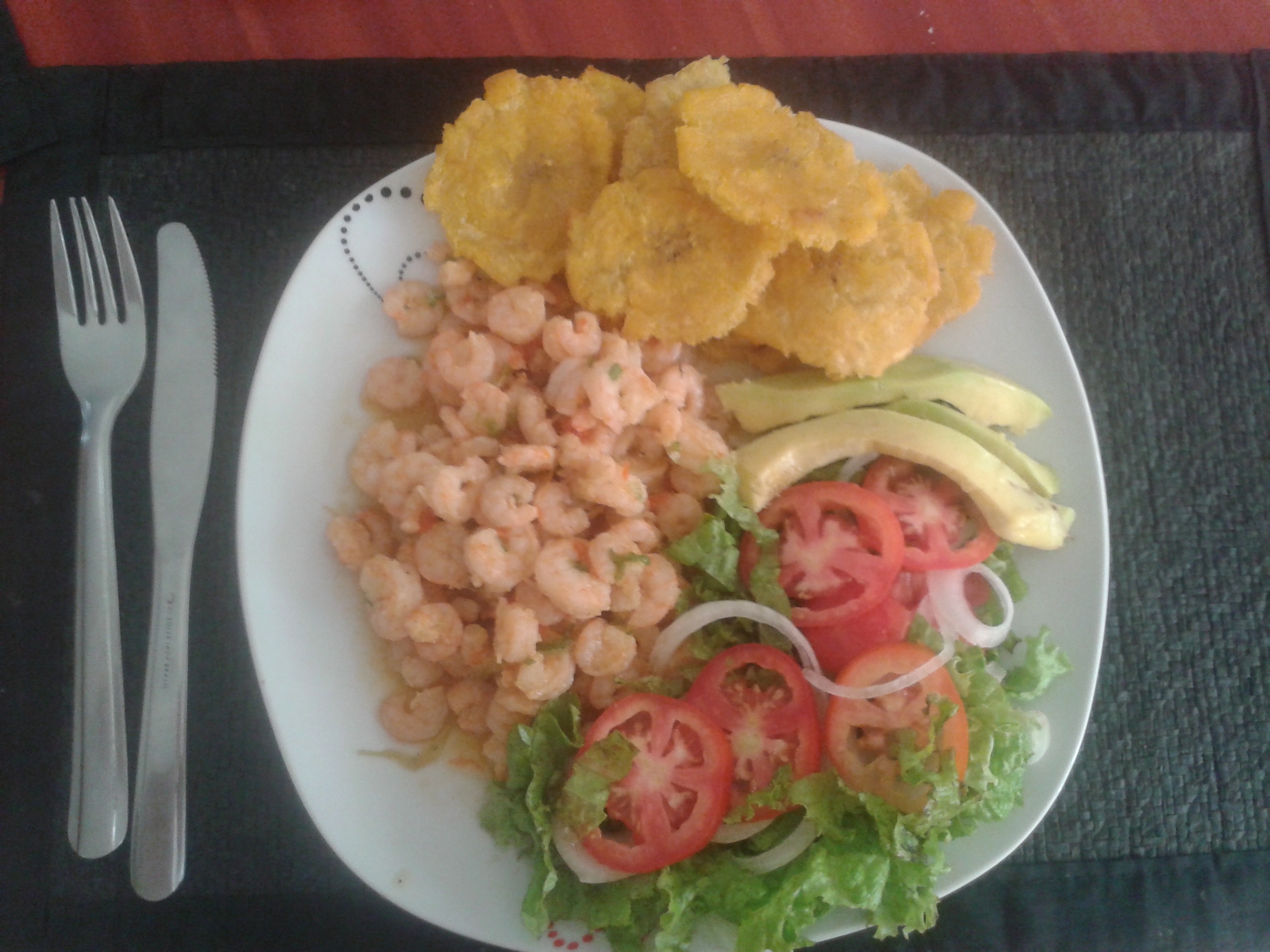 Un almuerzo diferente para dos personas en un día sábado disfrutado de la compañía de mi esposa, como se ve en la foto son camarones al ajillo acompañada de una ensalada mixta con tostones salados.