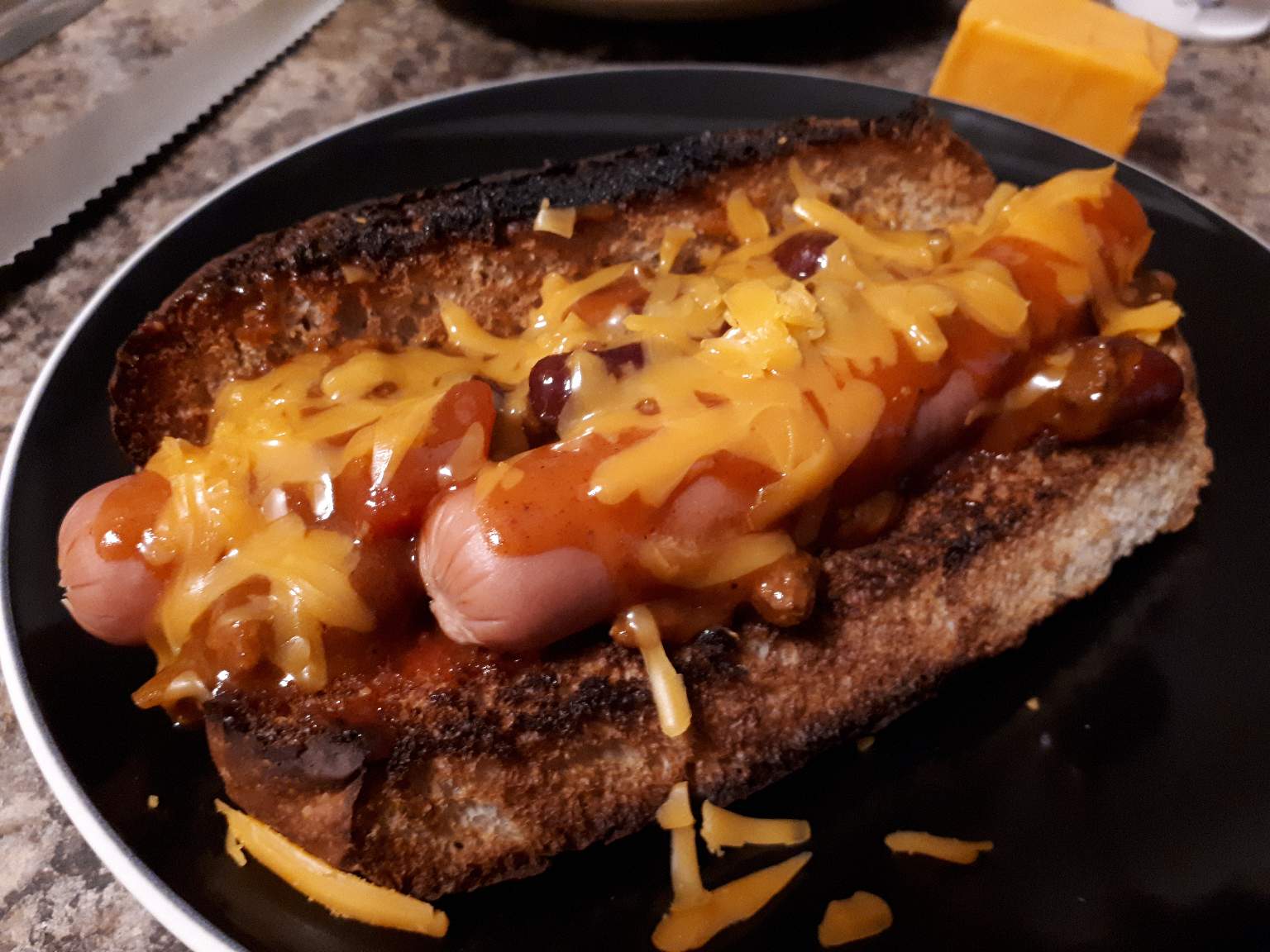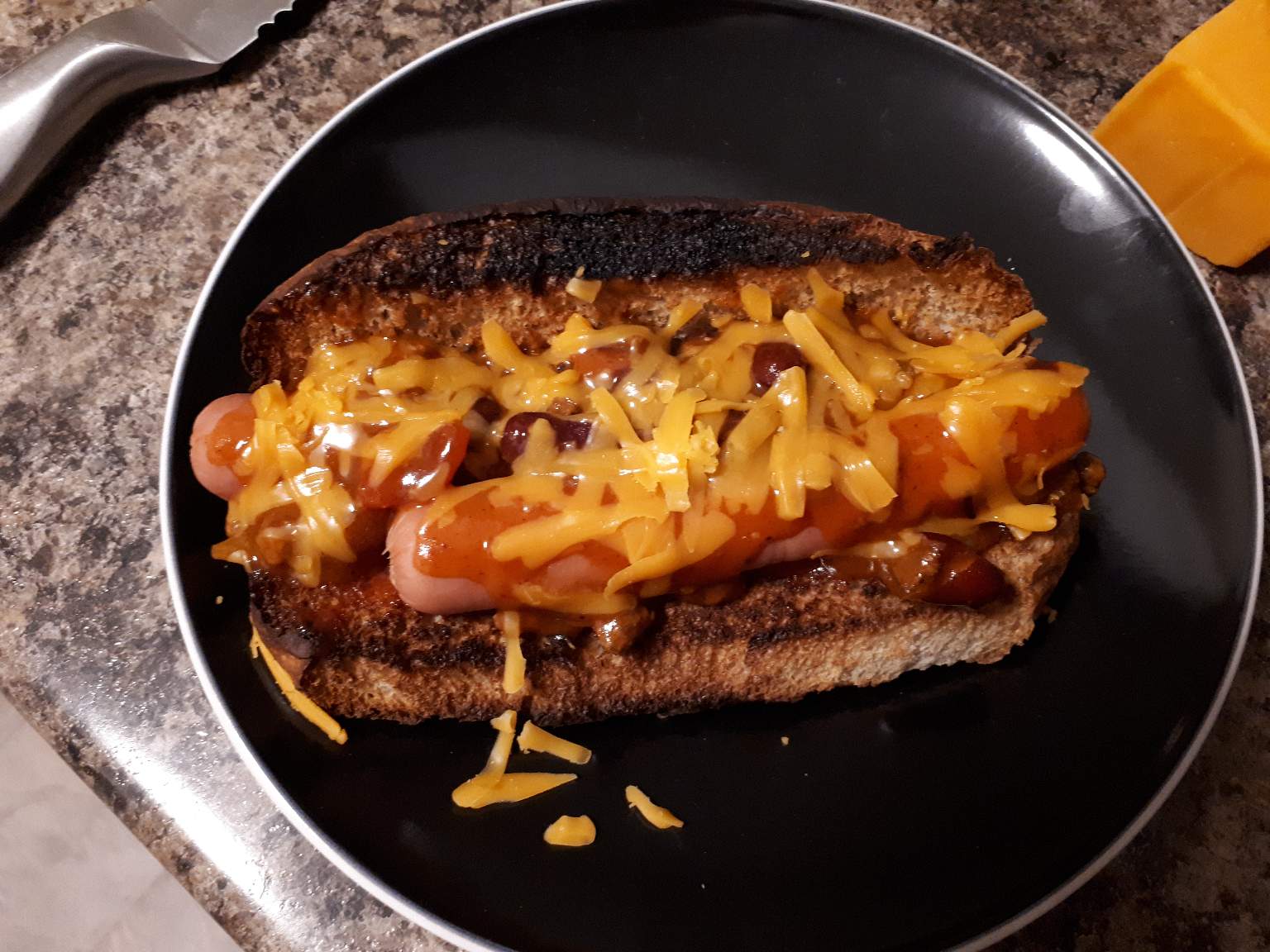 I toasted the bun in the toaster oven, put two boiled hot dogs on top, which were plump actually when I first took them out but not overly plump as to over cook them. I then put a couple of tablespoons of cooked canned *Stags" chili on top, then I added grated cheddar cheese! The heat from the Chili melted the Cheese! ***Glad you liked my dogs @intelliguy , thanks!๐๐๐