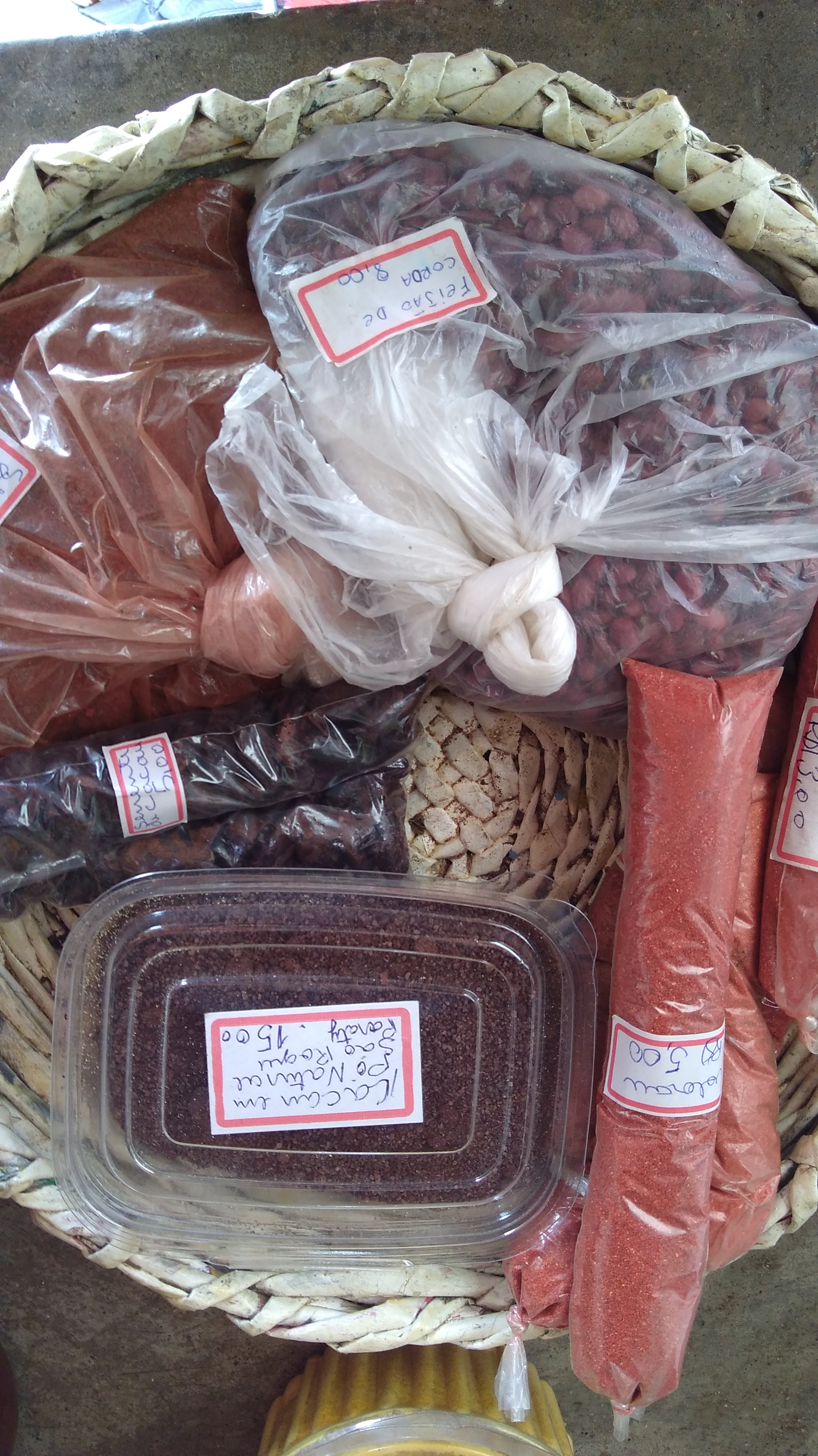 Here you can see dried cacao nibs, ground cacao, and also little sachets of urucum (Bixa orellana). Urucum/coloral is used as a food colouring and flavouring, and is also well-known as being used by indigenous peoples as body paint.