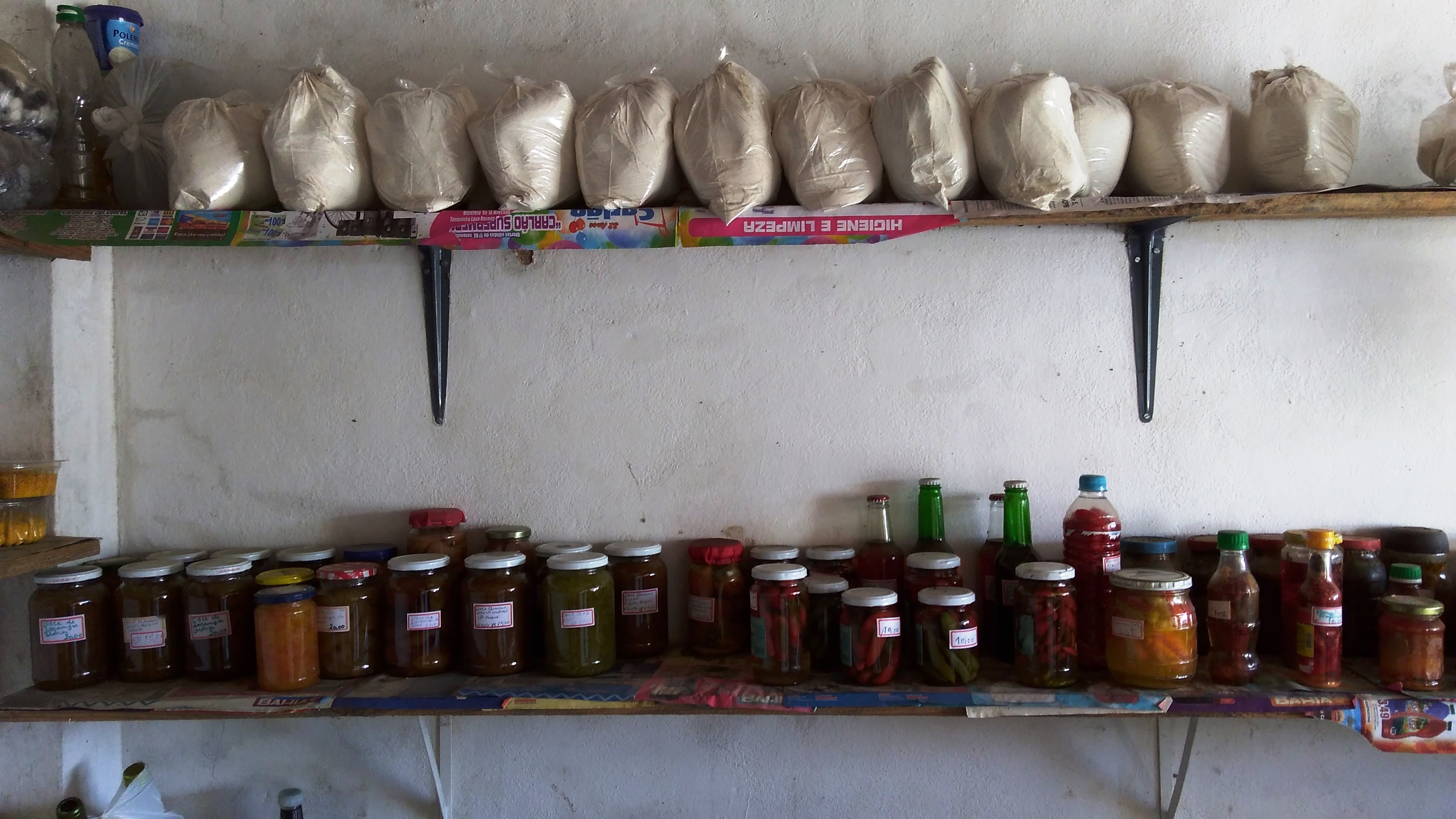 Dona Elizabeth sells many conserves. On the top shelf is a load of manioc flour (this gets sprinkled on top of beans during meals), on the lower shelf is an array of jarred chilis, many of which are malagueta (Capsicum sp.).