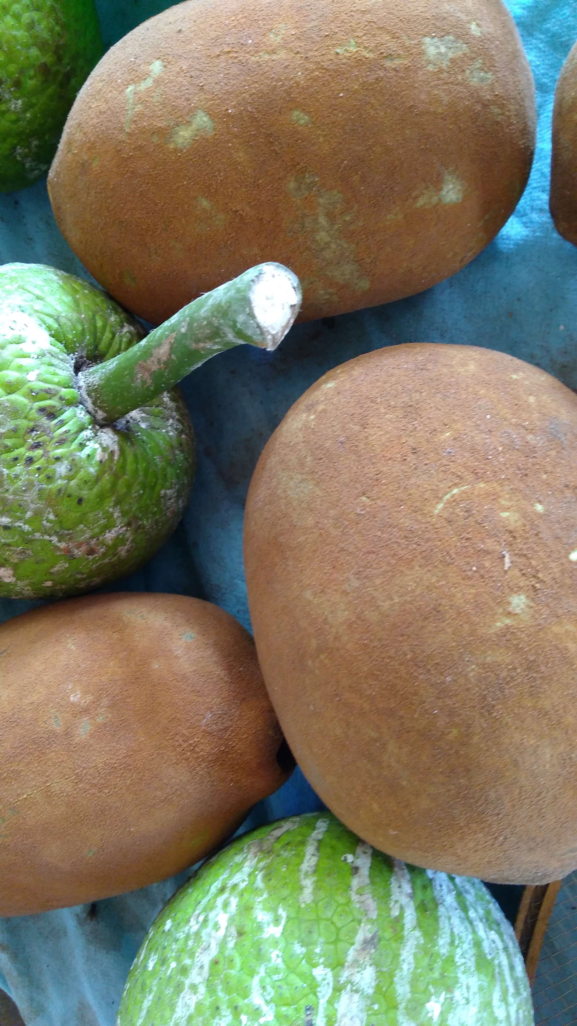 Cupuaçu (Theobroma grandiflorum) and breadfruit (Artocarpus altilis). Cupuaçu is a much celebrated nutritious fruit, it is related to cacao. The outer cask is woody and thick with a fuzzy outside, and inside the pulp is white (surrounding seeds not unlike cocoa), with a rich fruity smell, like a mix of chocolate and pineapple, although it tastes more like a pear.