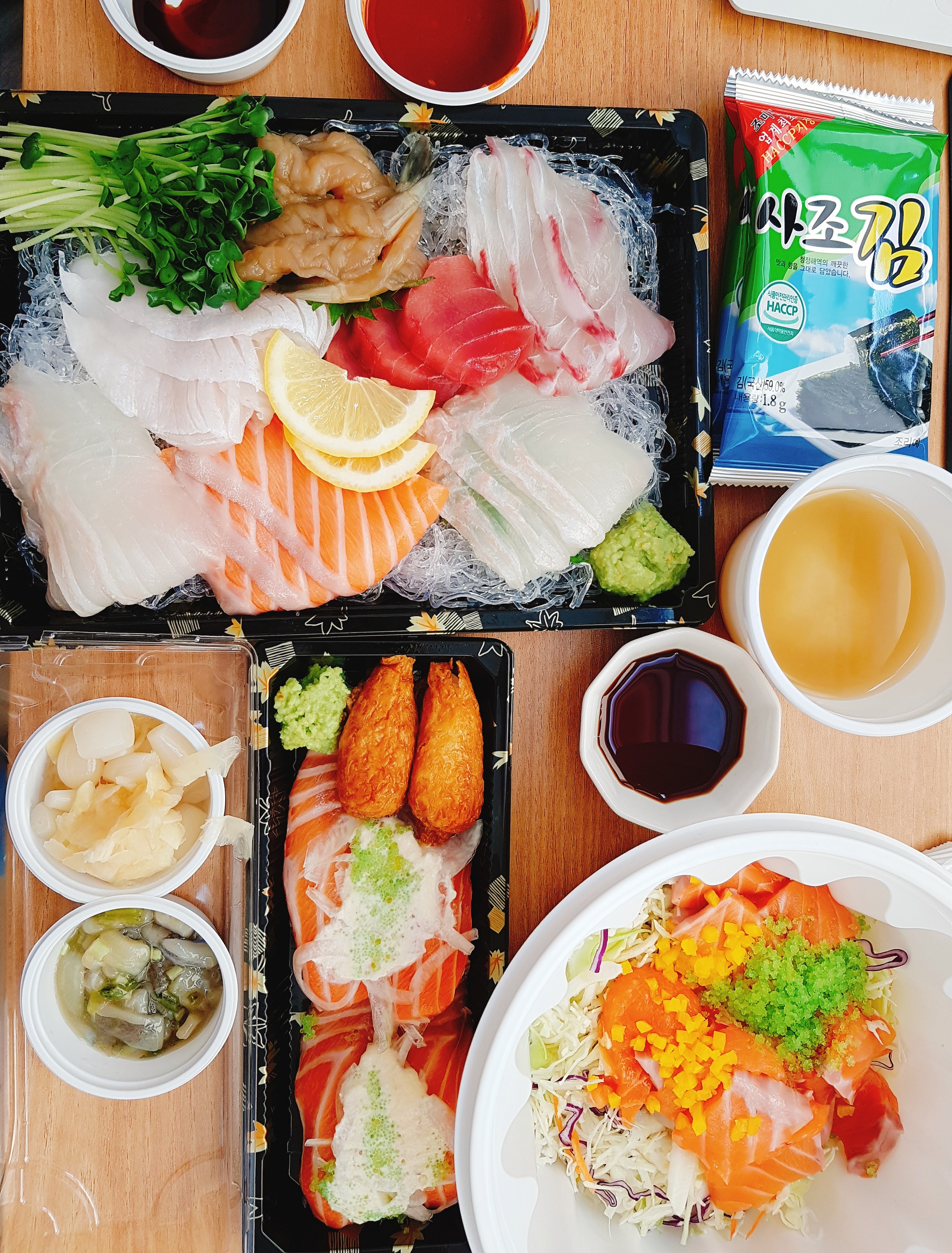 모듬회와 연어초밥을 주문해서 냠냠하고있어요!