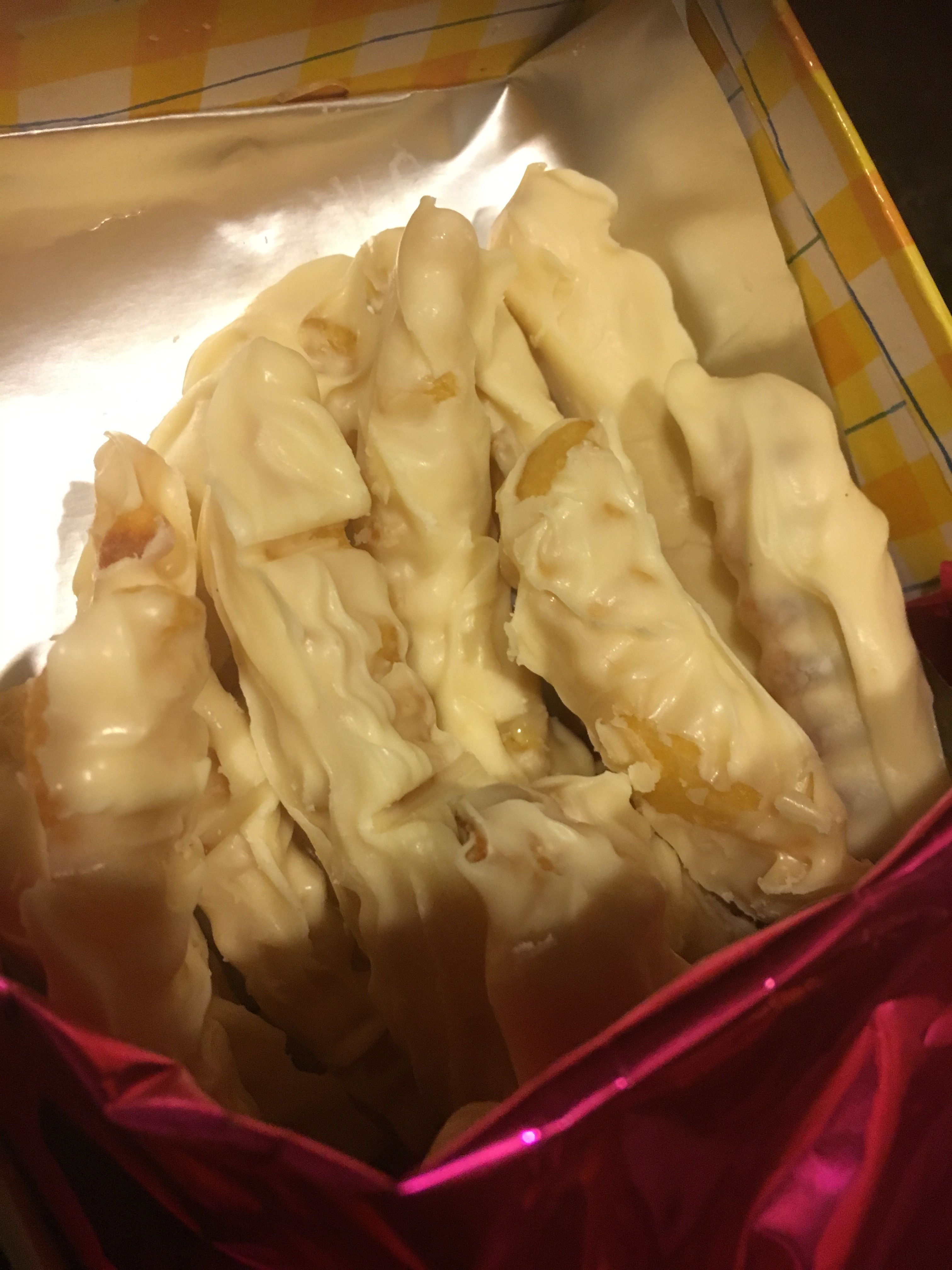 These are crinkle cut fries...baked as crispy as I could get them...and dipped in white chocolate.