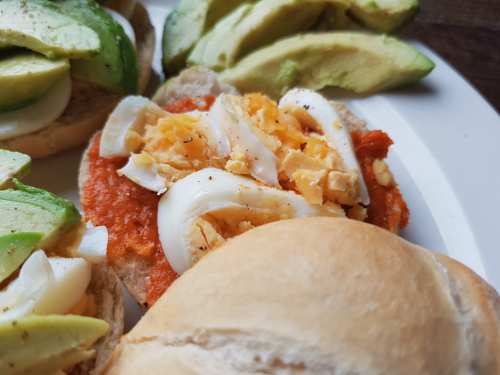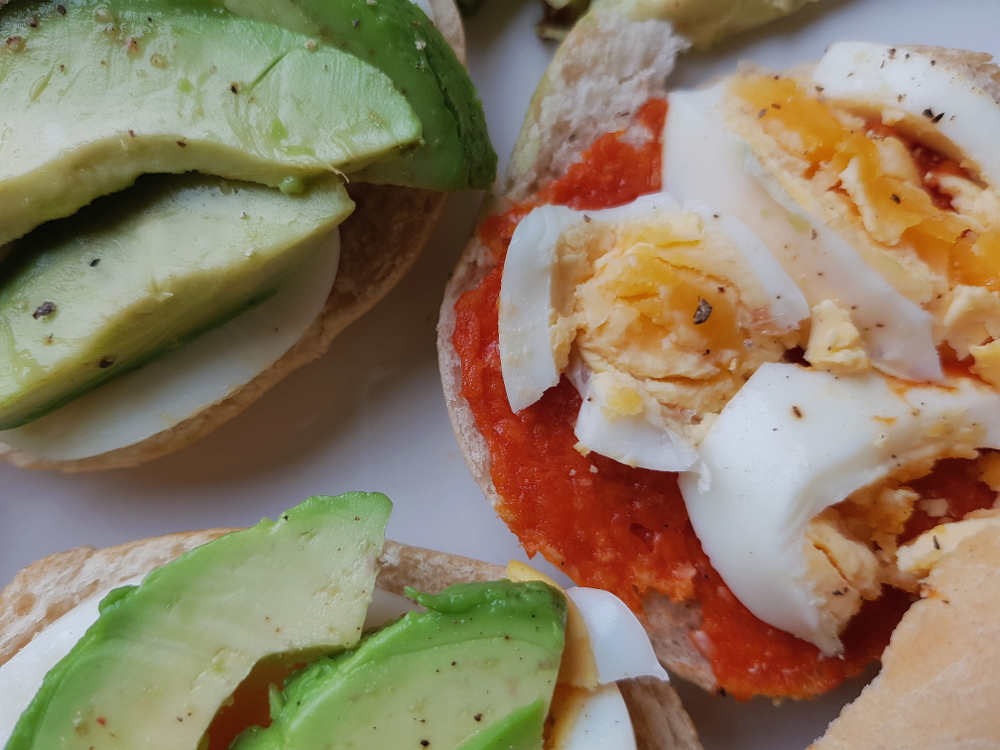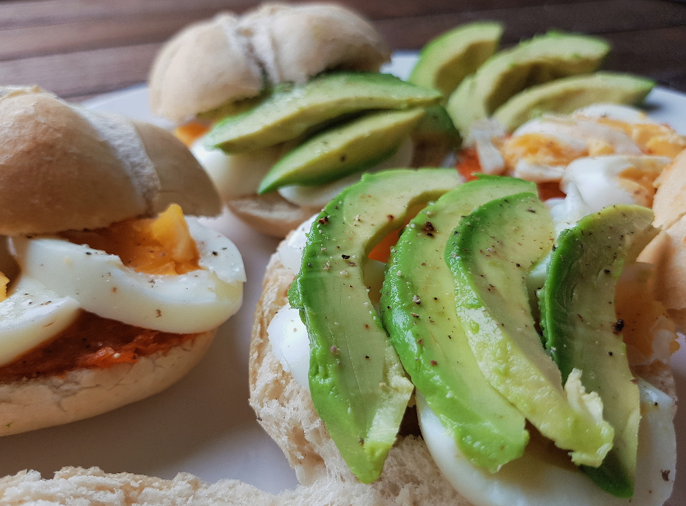 - For the Egg & Avocado buns: put slices of egg on two of the buns and top of with slices of avocado. Again, salt and pepper to top it off.