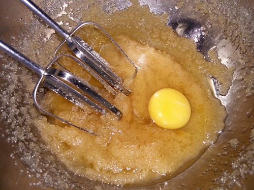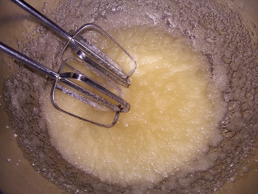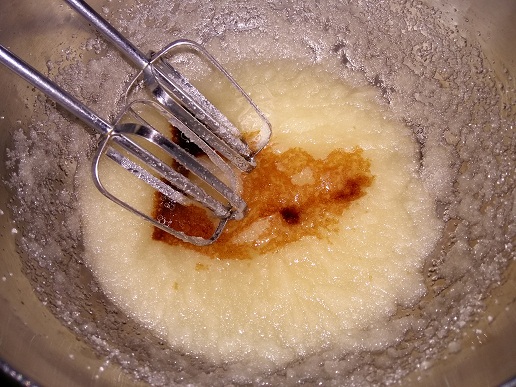 - Place the oil and the sugar in a bowl, add the vanilla and the esence. Mix well till the mixture gets white