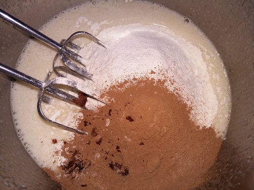 - Sieve the flour and the cocoa together with the baking powder, and add it to the above
