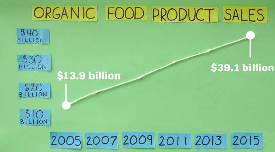 The image here shows the sales of organic food products over the past ten years. They’ve jumped from nearly $14 billion in 2005 to almost $40 billion in 2015.