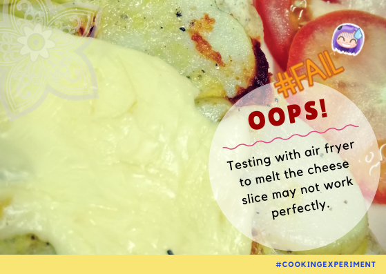 I thought to speed things up I would acquire the air fryer to help me do the last part to melt the cheese while I prepared the next slice; but not realising that air fryers relies on both heat and wind to circulate it, a cold slice of cheese could actually be flown off and slide at the side.
