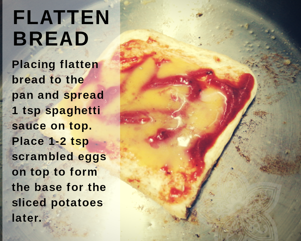 I added spaghetti sauce at the base and added a little of seasoned scrambled eggs mixture at the top to hold the potatoes later as they are cooked.