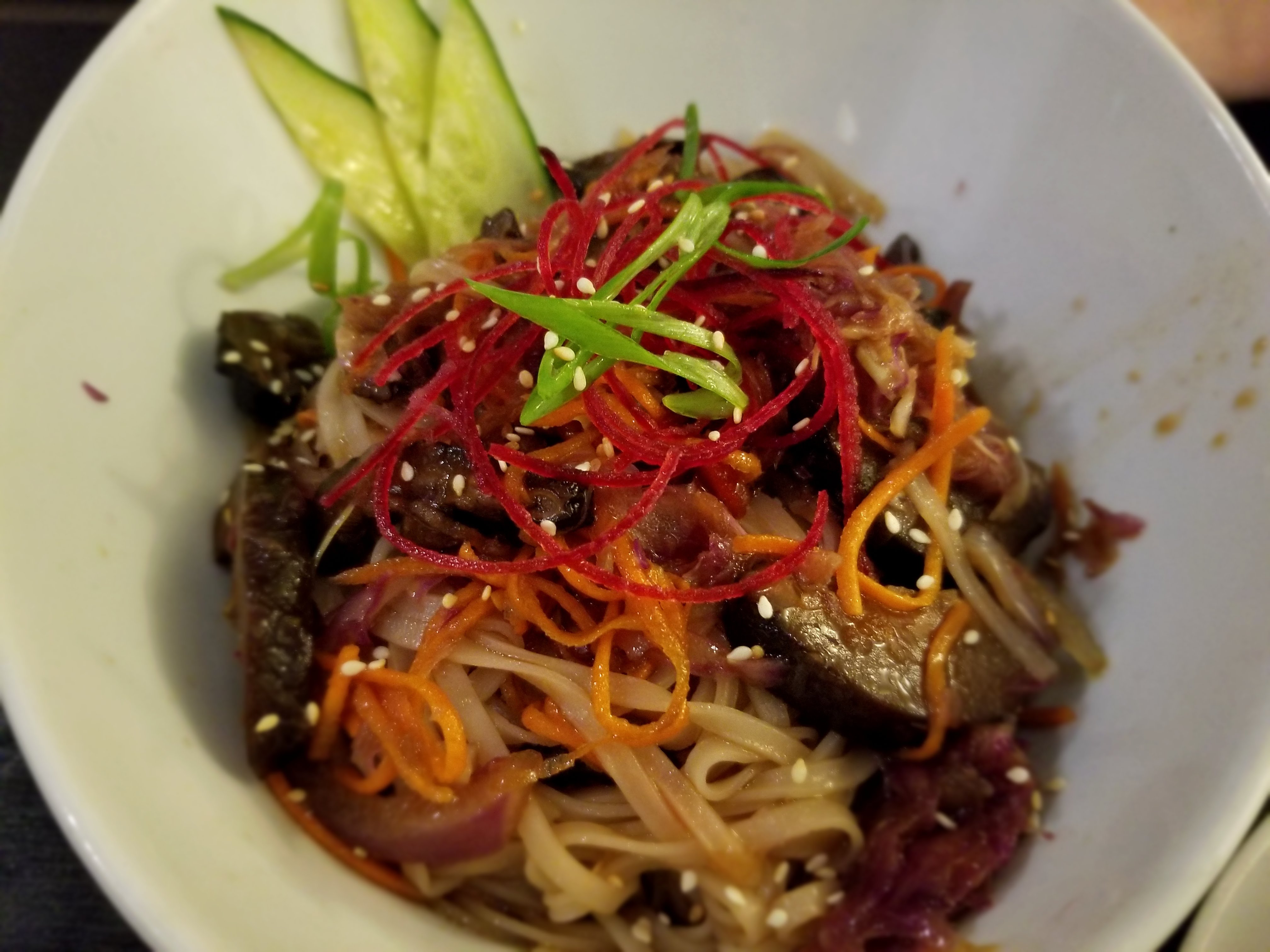 We ordered the vegetarian thai noodle and jasmine rice with honey glazed shiitake mushroom and green curry. The only meat dish offered on the menu is the teriyaki chicken, all of which tasted fantastic.