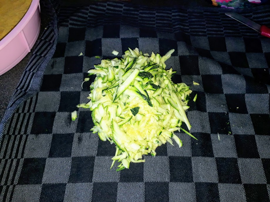 melt the chocolate in the microwave and grate the washed zucchini. After you've grated the zucchini squeeze the excess moisture with a clean cloth.