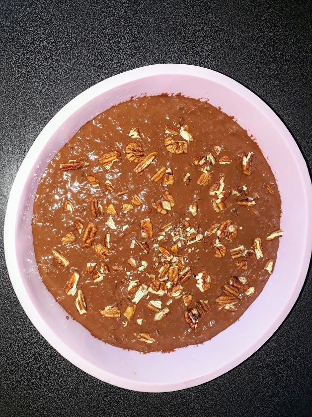 Starting with this very yummy Chocolat pecan pie. There is one ingredient I would never thought off of putting in a cake but it is delish. It will take you about 50 minutes to bake it.