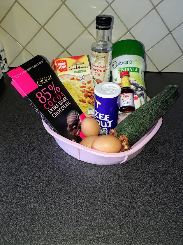 Add the zucchini, chocolate, vanilla aroma, 3 eggs, pecan nuts, coconut oil and sweet leaf in a bowl and use a mixer to mix it all together for about one minute.