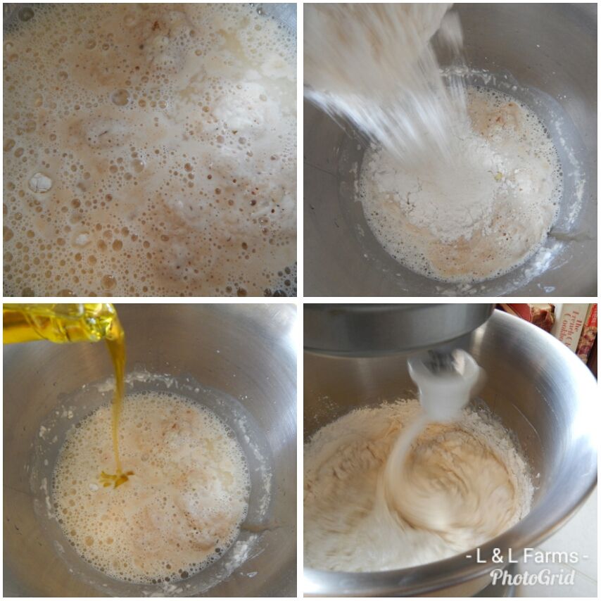 - Once you see those bubbles, we will add in our oil, salt and 3 cups of flour.