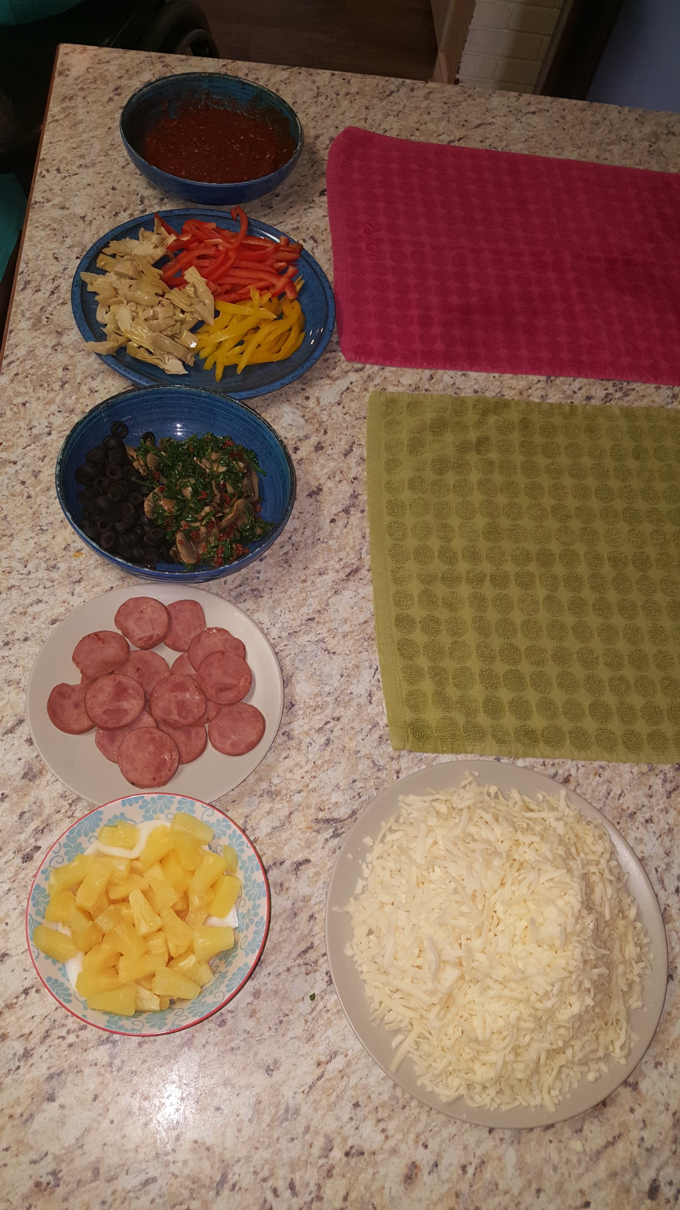 For this one I cooked the mushrooms and Spinach before hand to evaporate the moisture so it wouldn't make the pizza soggy.