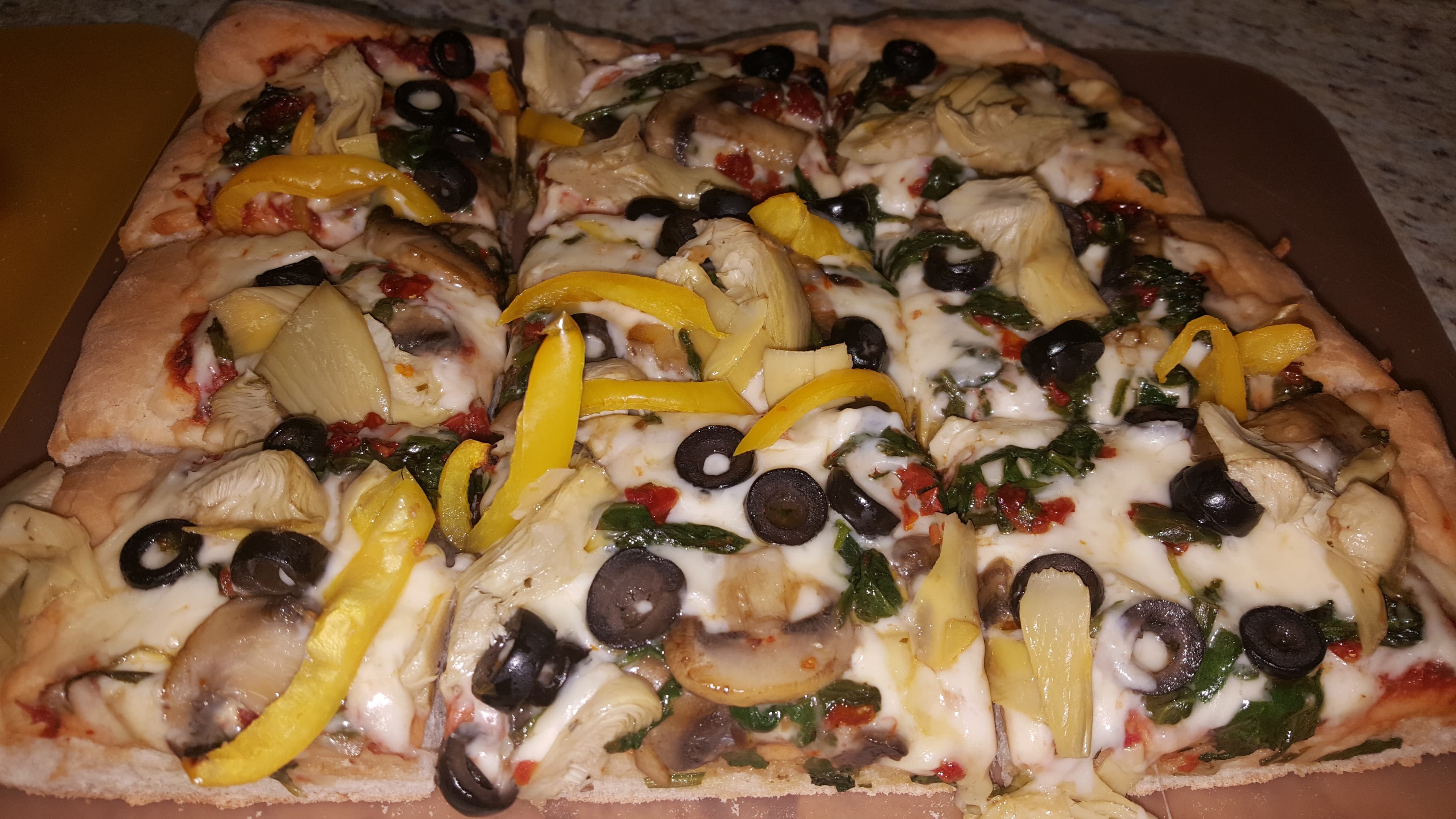 Pickled Artichokes, Sun-dried Tomatoes, Mushrooms, Black Olives, Spinach, Pizza Sauce with added fresh chopped Garlic and herbs (Parsley and Basil), Yellow Pepper and two Cheeses (Mozzarella and White Cheddar).