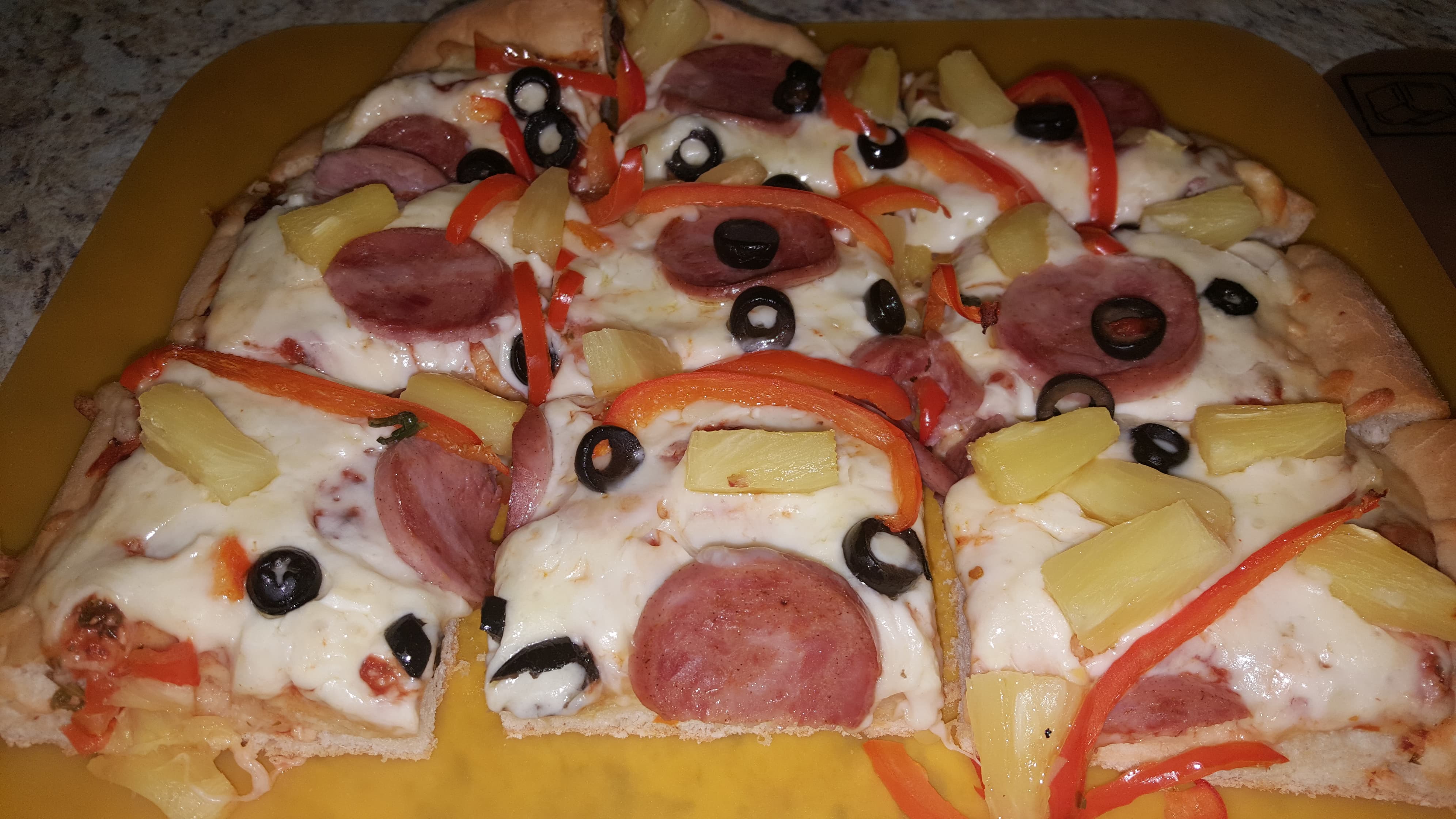 Turkey Keilbasa, Black Olives, Pineapple, Pizza Sauce with added extra fresh chopped garlic and herbs (Parsley and Basil), Red Pepper and two Cheeses (Mozzarella and White Cheddar).