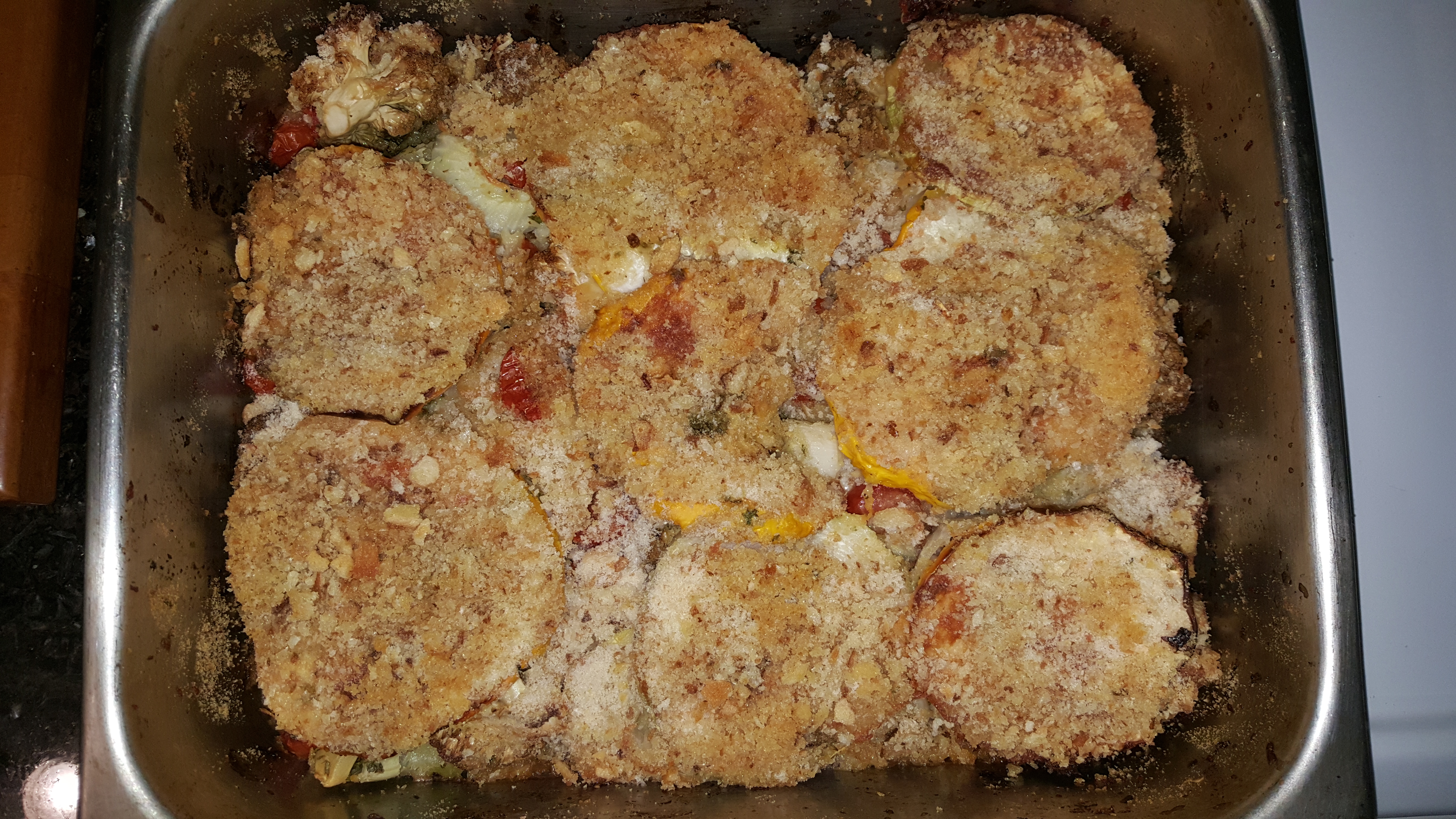 Layer the veggies in a oiled baking dish and add the cheese in the layers. Cover with aluminum foil and bake at 350 for 30 minutes. Top with ground Breadcrumbs and drizzle with a melted butter/olive oil mixture (1/2 cup). Put uncovered back into the oven for approximately 1 hour or until bread crumbs are browned and casserole is cooked through.