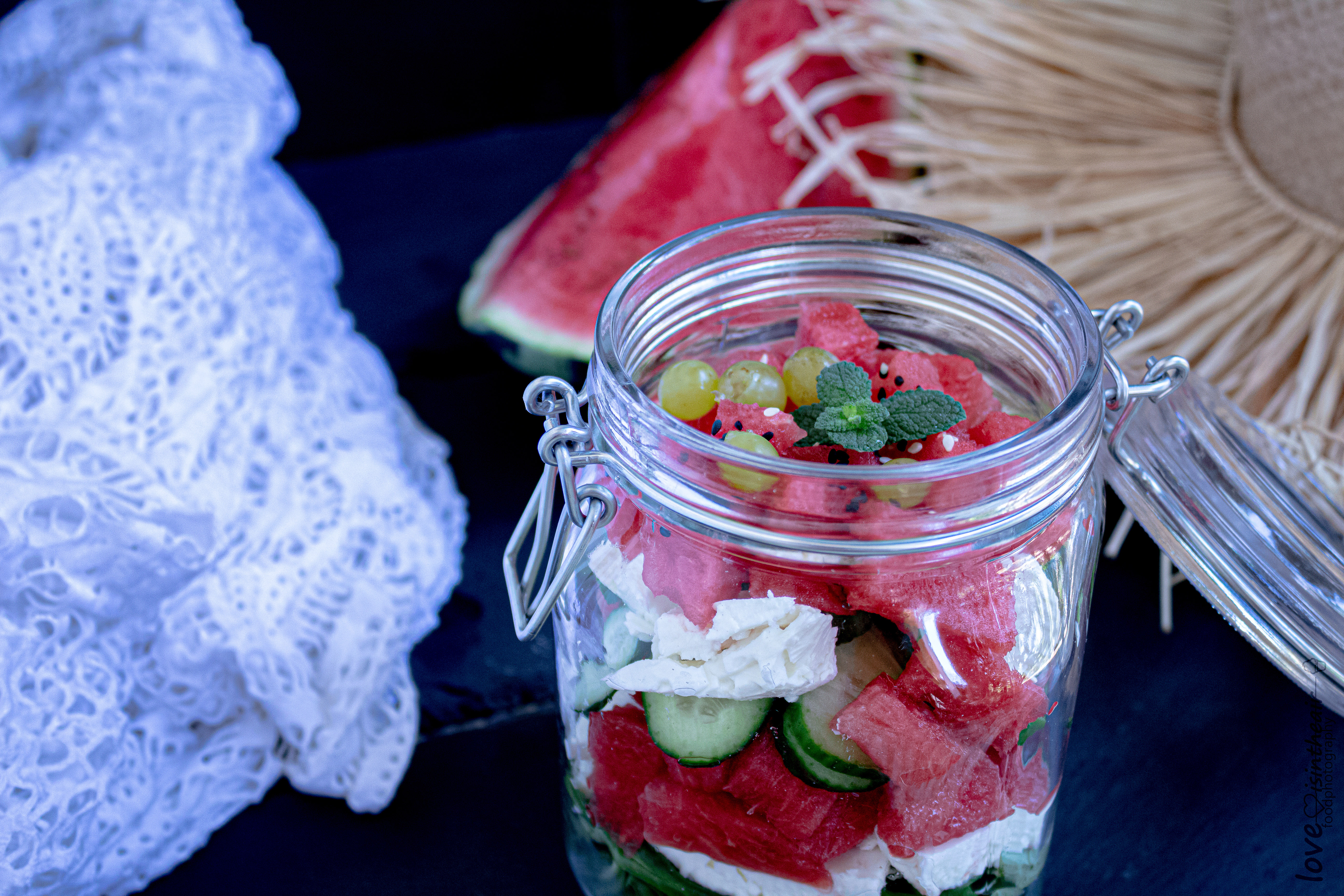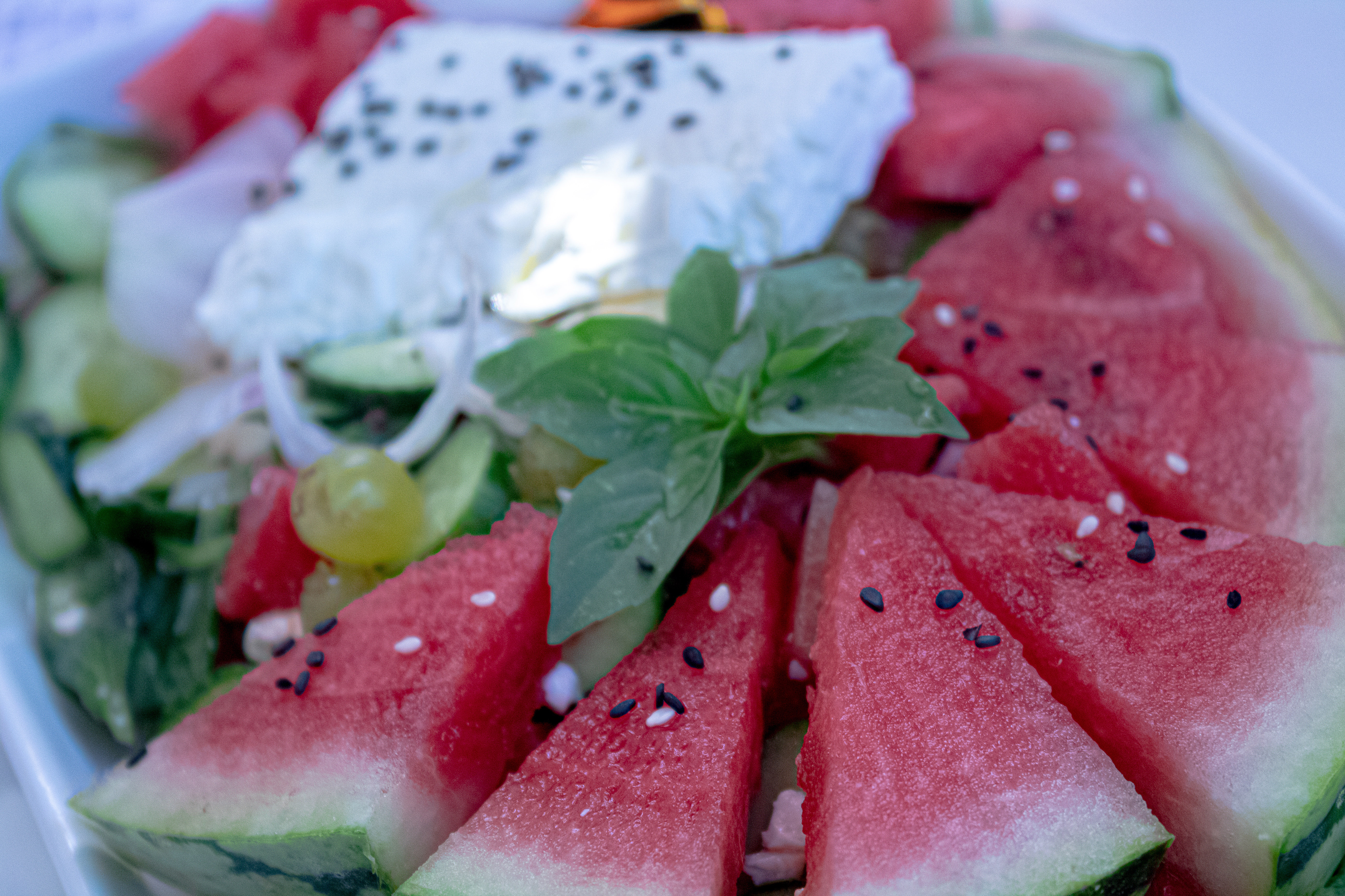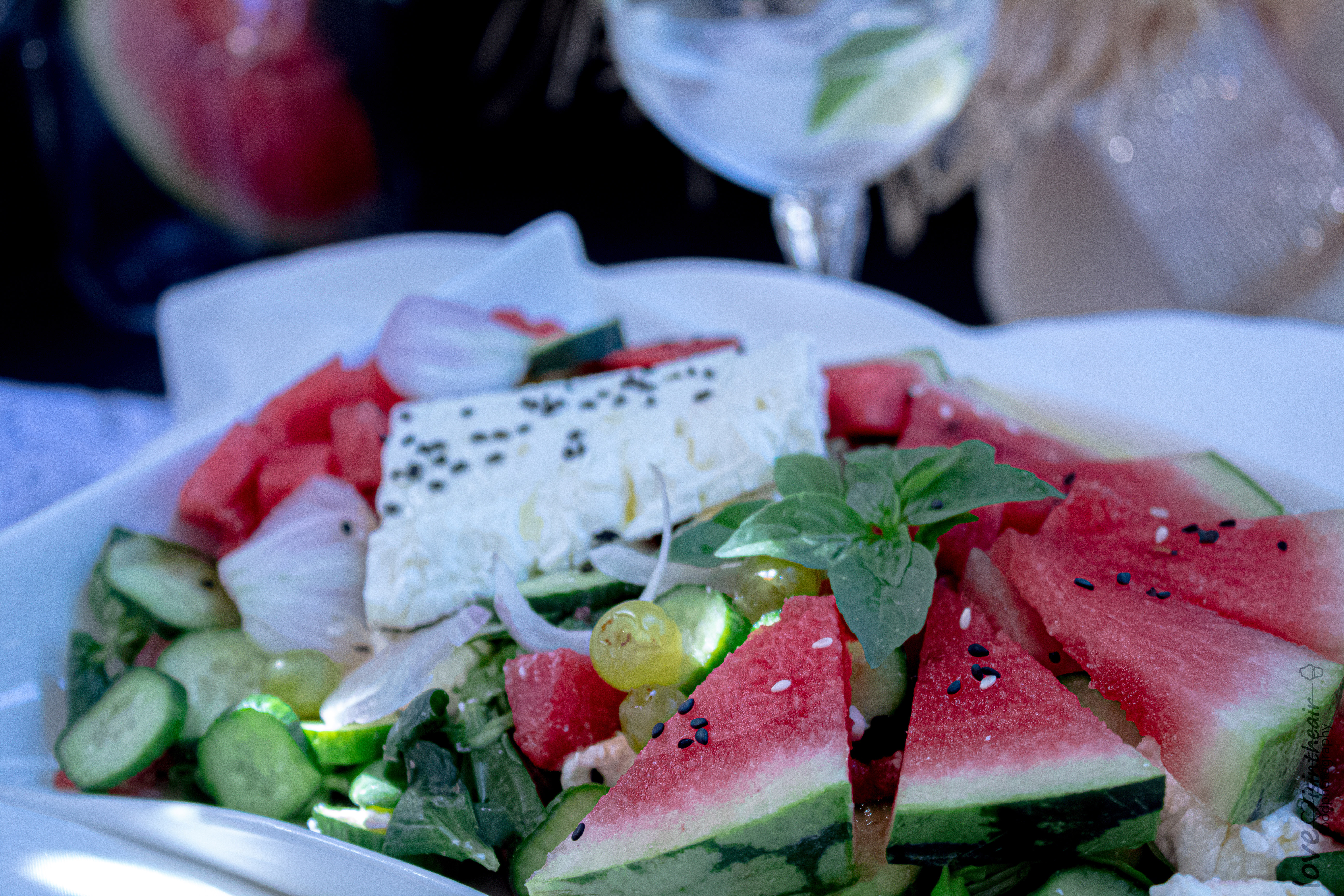 Watermelon, cucumber, feta cheese, valerian, black cumin seeds, basil,mint, red onion, grapes and a few drops of olive oil and fresh lime juice , are the ingredients for this beautiful salad with summer flavors and fragrances..You could add sea salt flakes for garnish. I love the saltiness of feta and the sweetness of watermelon. A cool combination that rocks! But If you are not a fan of feta, other white cheeses, like fresh mozzarella balls, would also work.