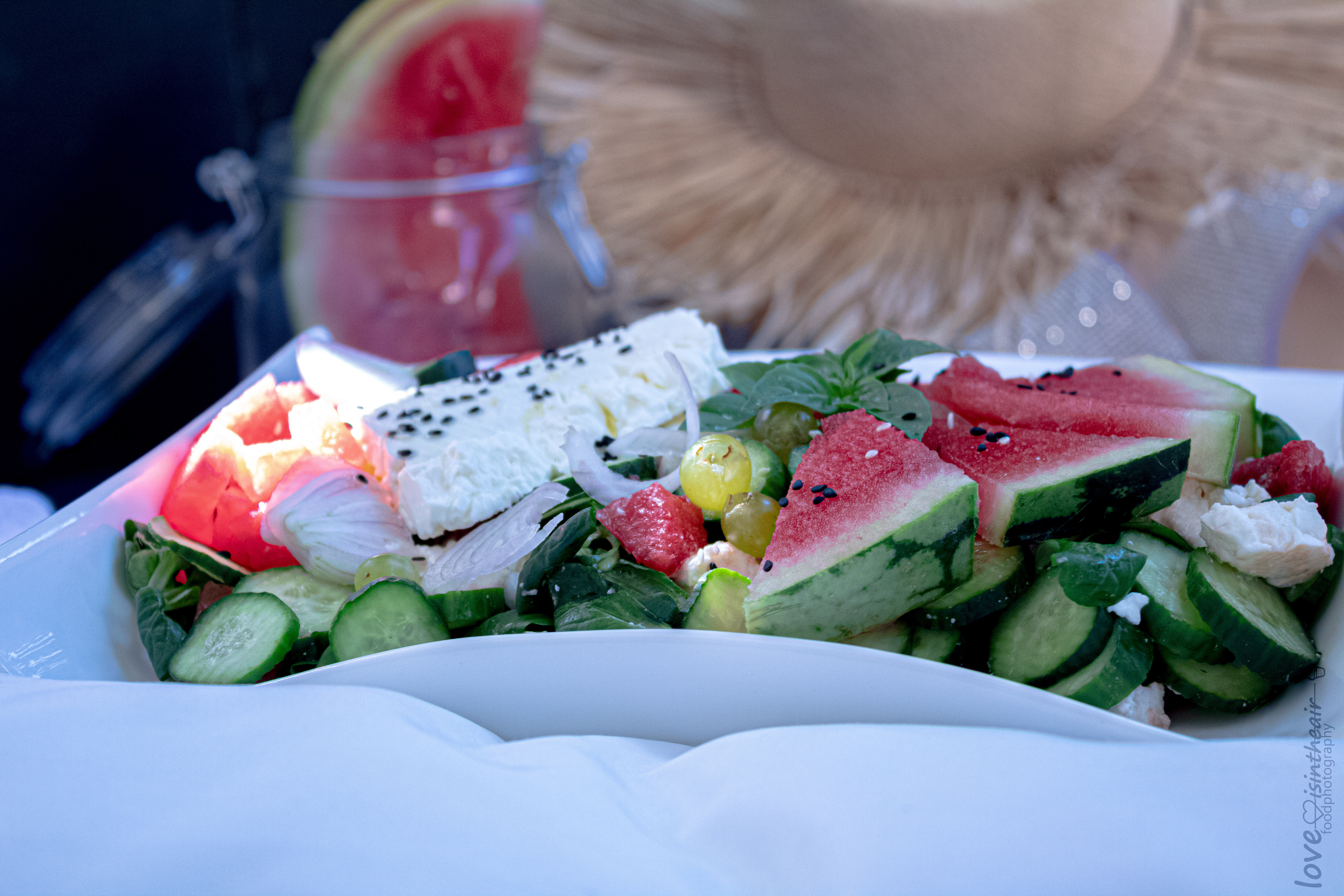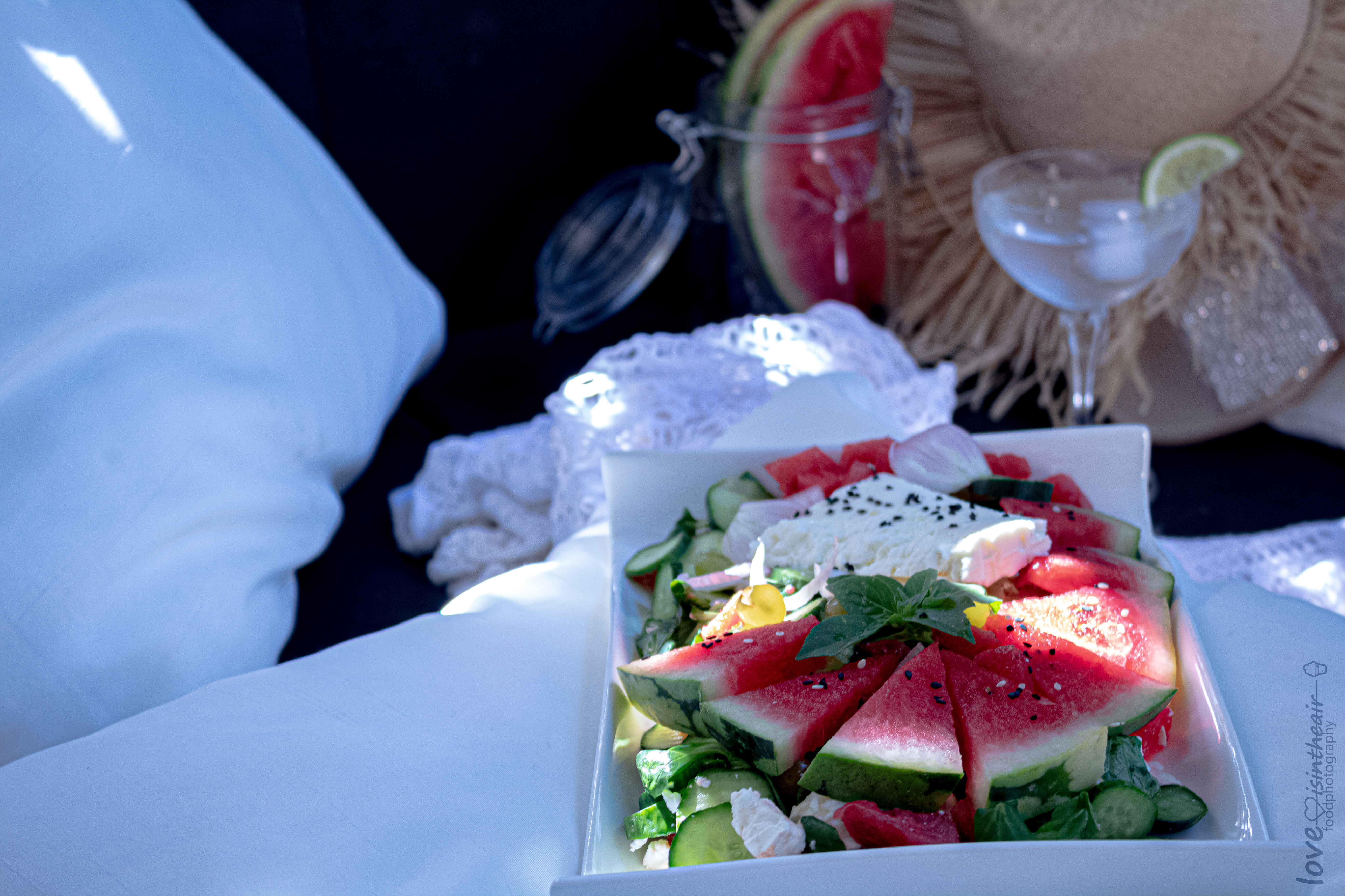 Wow, the photos are great and the salad looks so tasty and refreshing! Watermelon with feta is a classic combination in Greece, the rest of the ingredients would make a wonderful result, I am sure about it, but... onions?? It seems so bold and risky, that I will certainly try it as soon as I am in my village for the weekend, where there is a plethora of fresh materials. Thank you for the great idea!