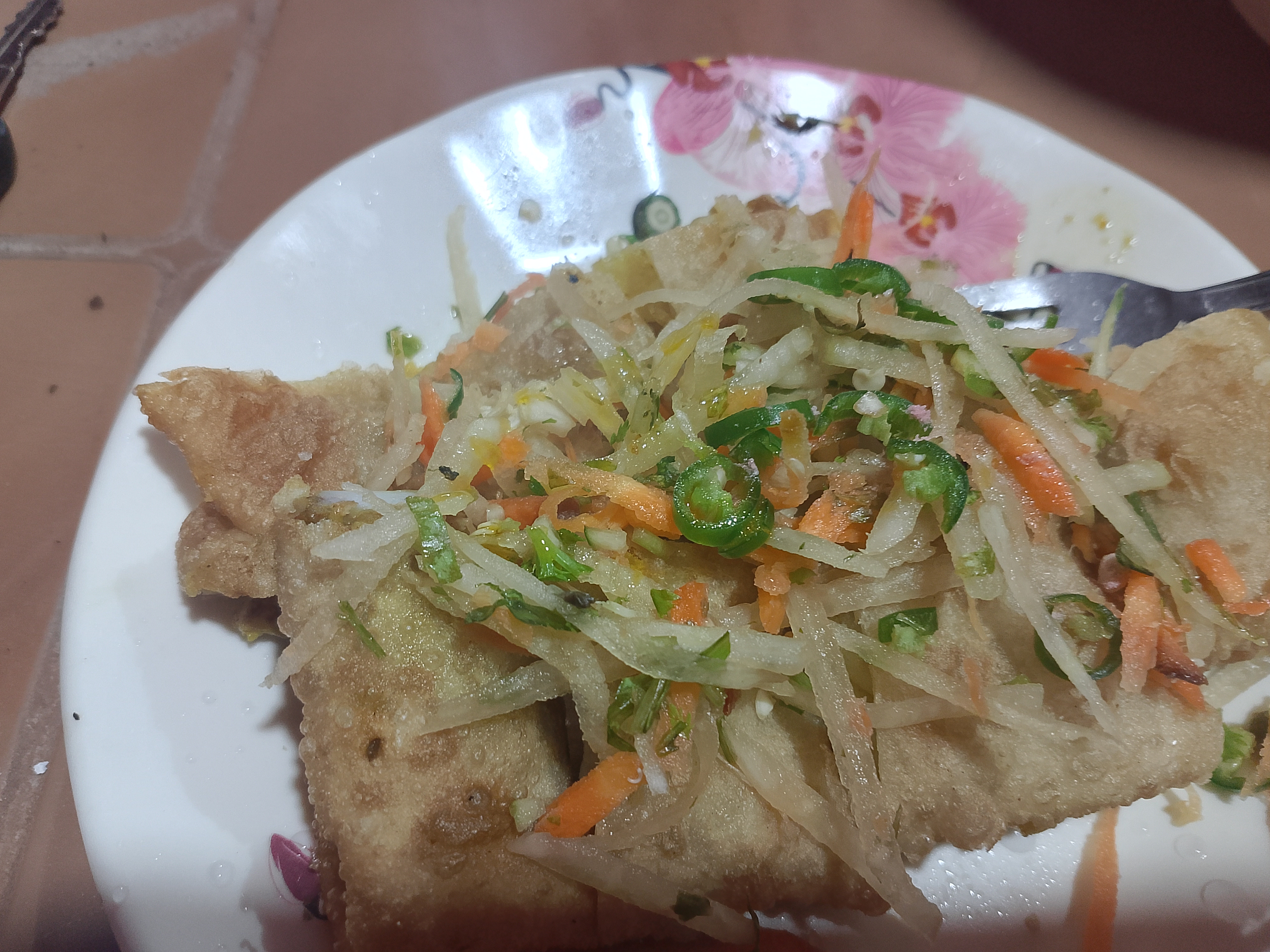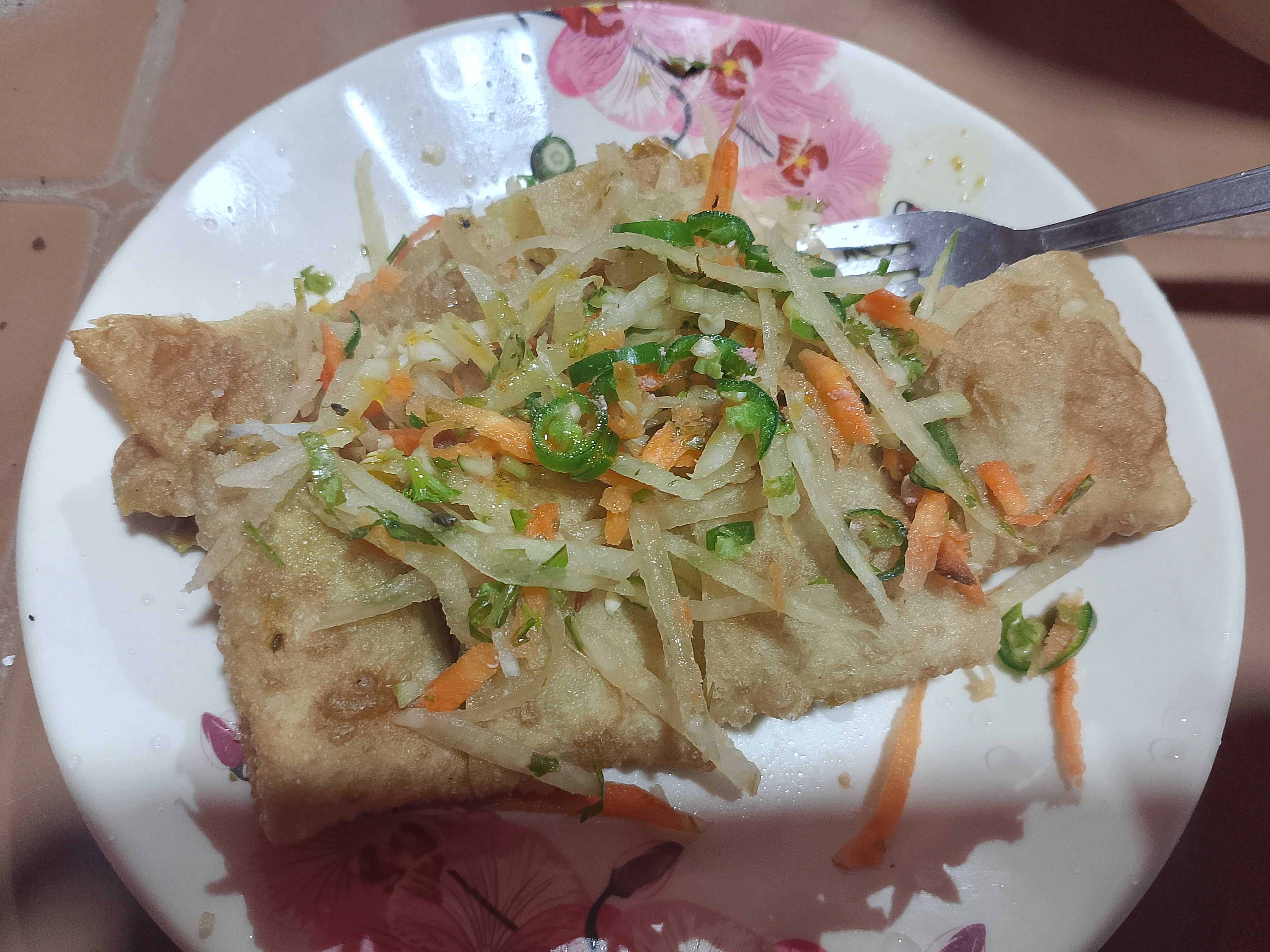 Moglai was prepared, and the meat Moglai tasted very delicious. On top of the Moglai, salad was added, such as chilies, onions, cucumbers, and carrots, which were mixed and placed on it to make it even more flavorful. Today, after many days, I ate Moglai at the market. There were two of us, and we shared one Moglai by taking half each.