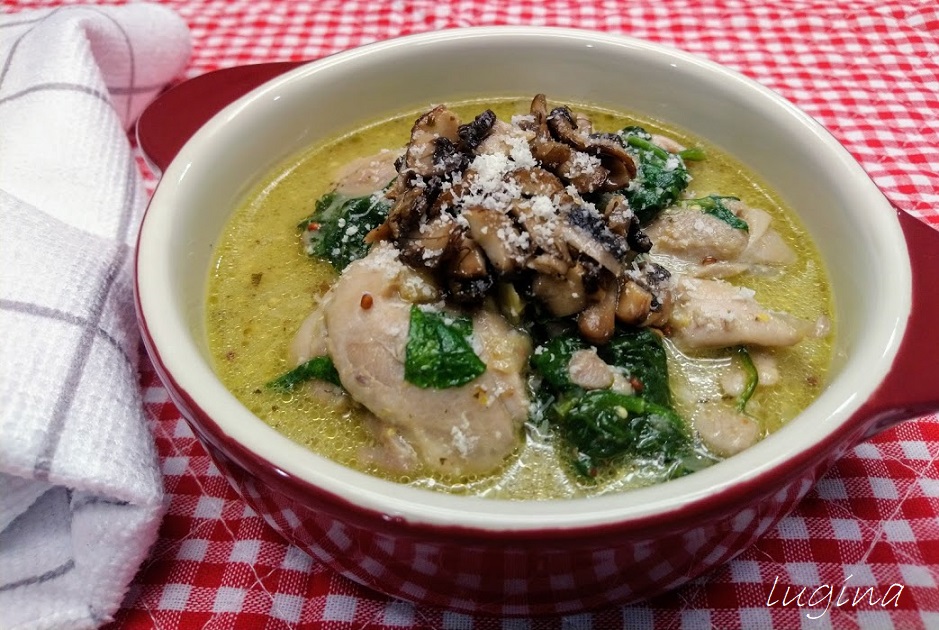 Add the spinach, fresh basil and blended artichoke at the end. Serve with some sprinkles of cooked mushroom and a little bit of grated cheese.
