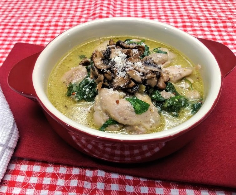 Boneless chicken (cut), spinach, 3 to 4 fresh artichoke (clean and cut), garlic powder,1 tbsp of whole Dijon mustard ,salt, pepper, dried basil, dried oregano, handful of fresh basil, chicken broth or regular water and 1.5 teaspoon of grill seasoning