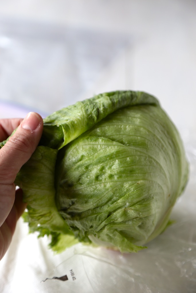 Next, get a handle on your head of lettuce like you're palming a ball. Fighting the temptation to dunk it into whatever canister is closest. With the stem at the base of the lettuce, utilizing a firm whack, hit the lettuce onto the counter.