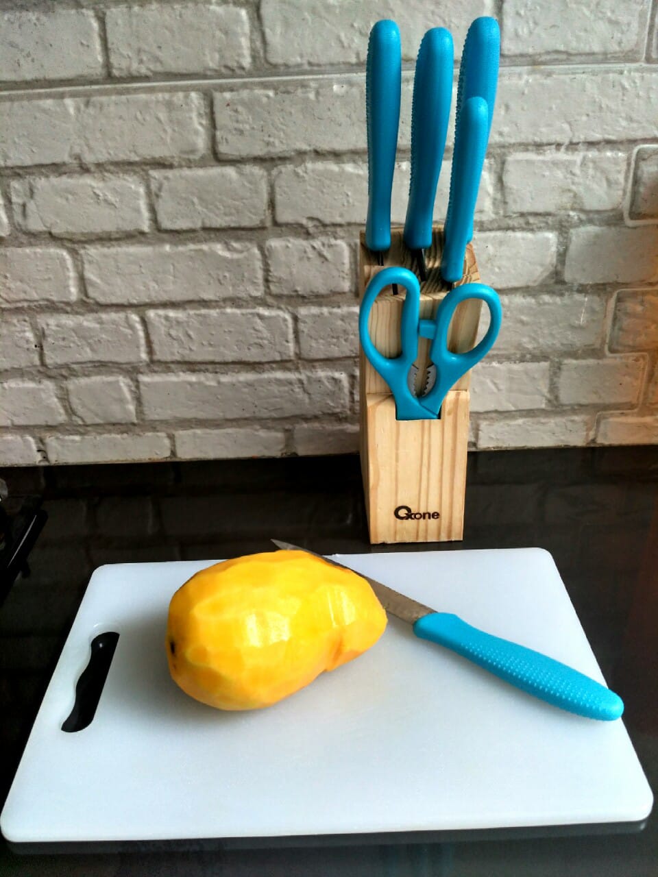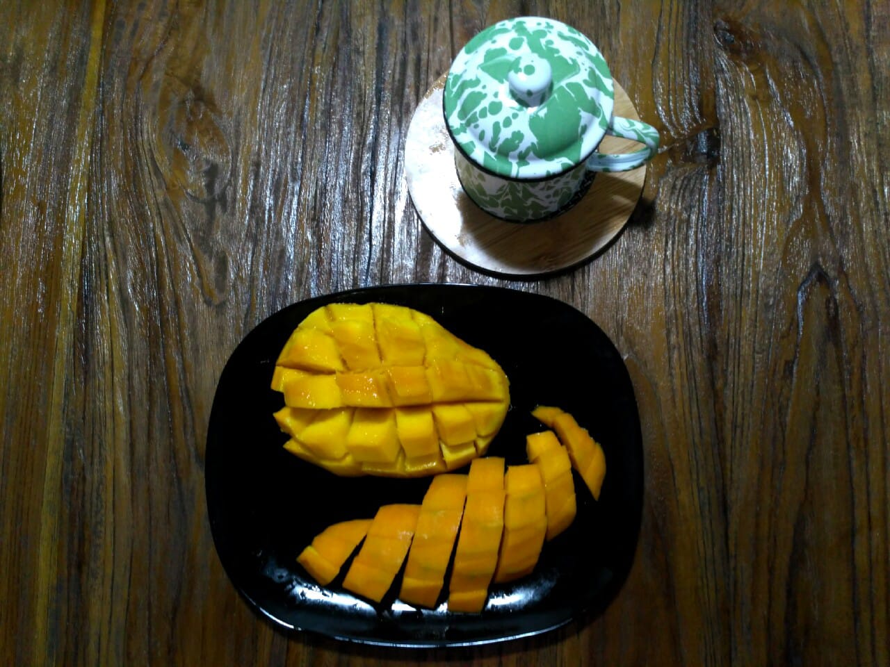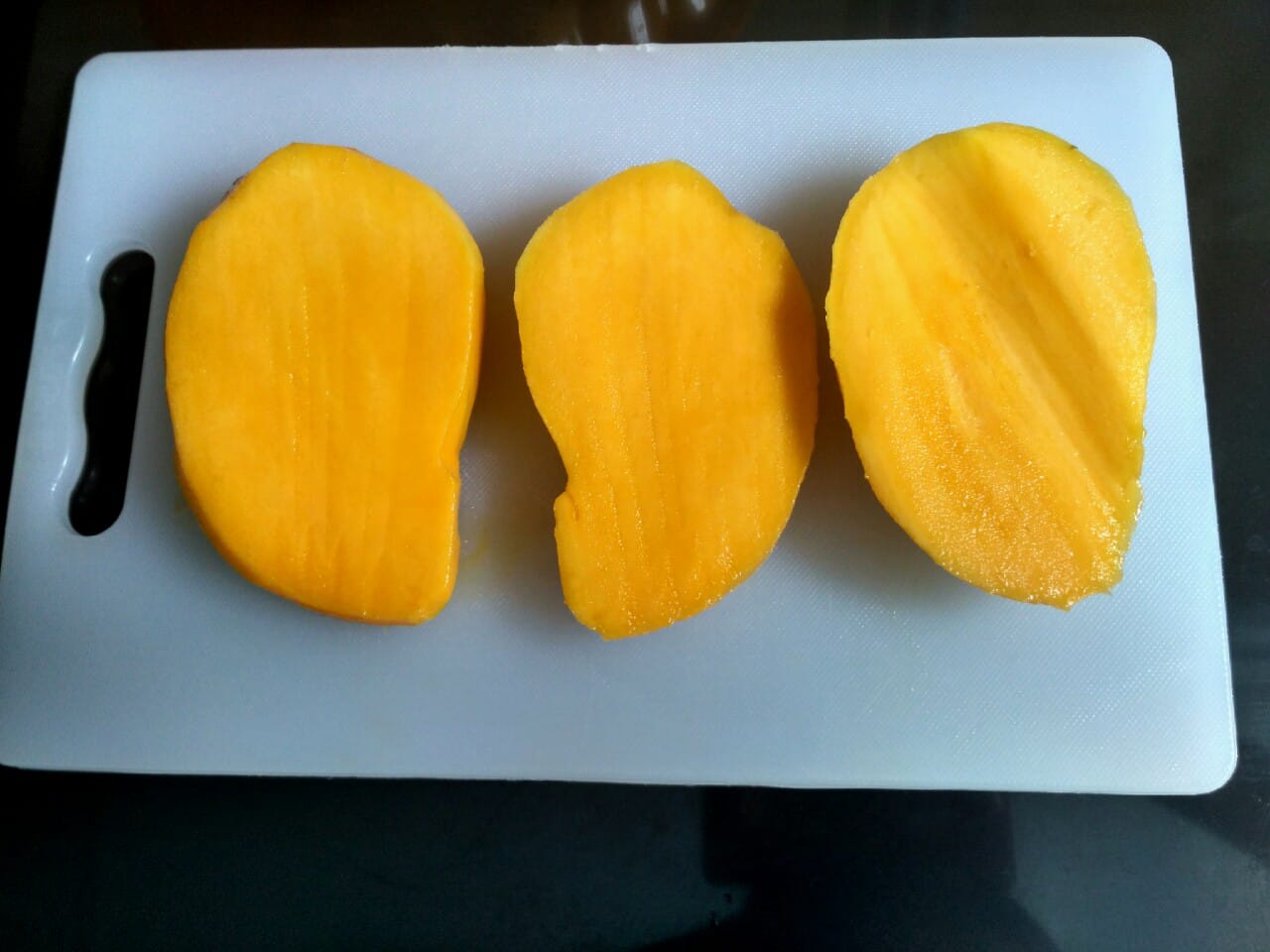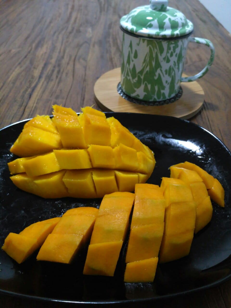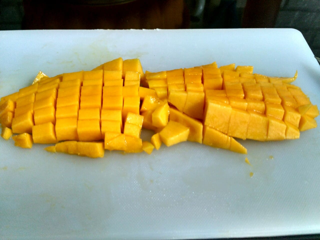 Jam menunjukkan pukul 18.00 WIB, saatnya bergegas mengupas mangga dan memotong menjadi beberapa bagian lalu blender dengan air. Sebagian lagi di potong dadu.