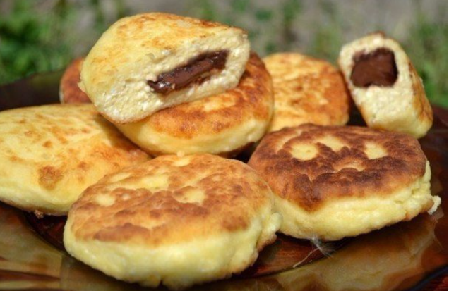 - Sprinkle flour on your hands. Put a small part of the mass with a tablespoon on your hand, on top - a piece of chocolate and form a cheesecake.