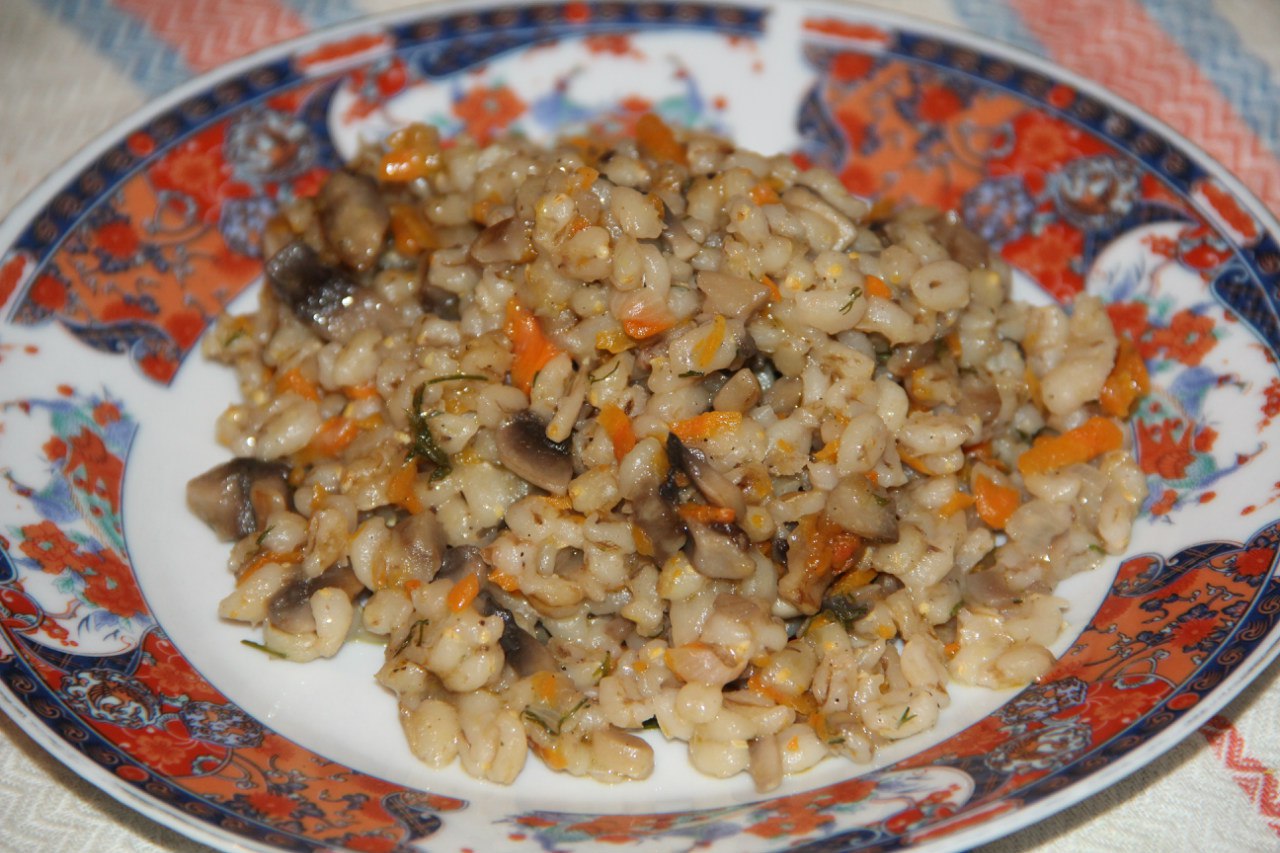 6. Add to the pan the mushrooms, barley, salt, pepper, add a little water, simmer on low heat for 30 minutes.