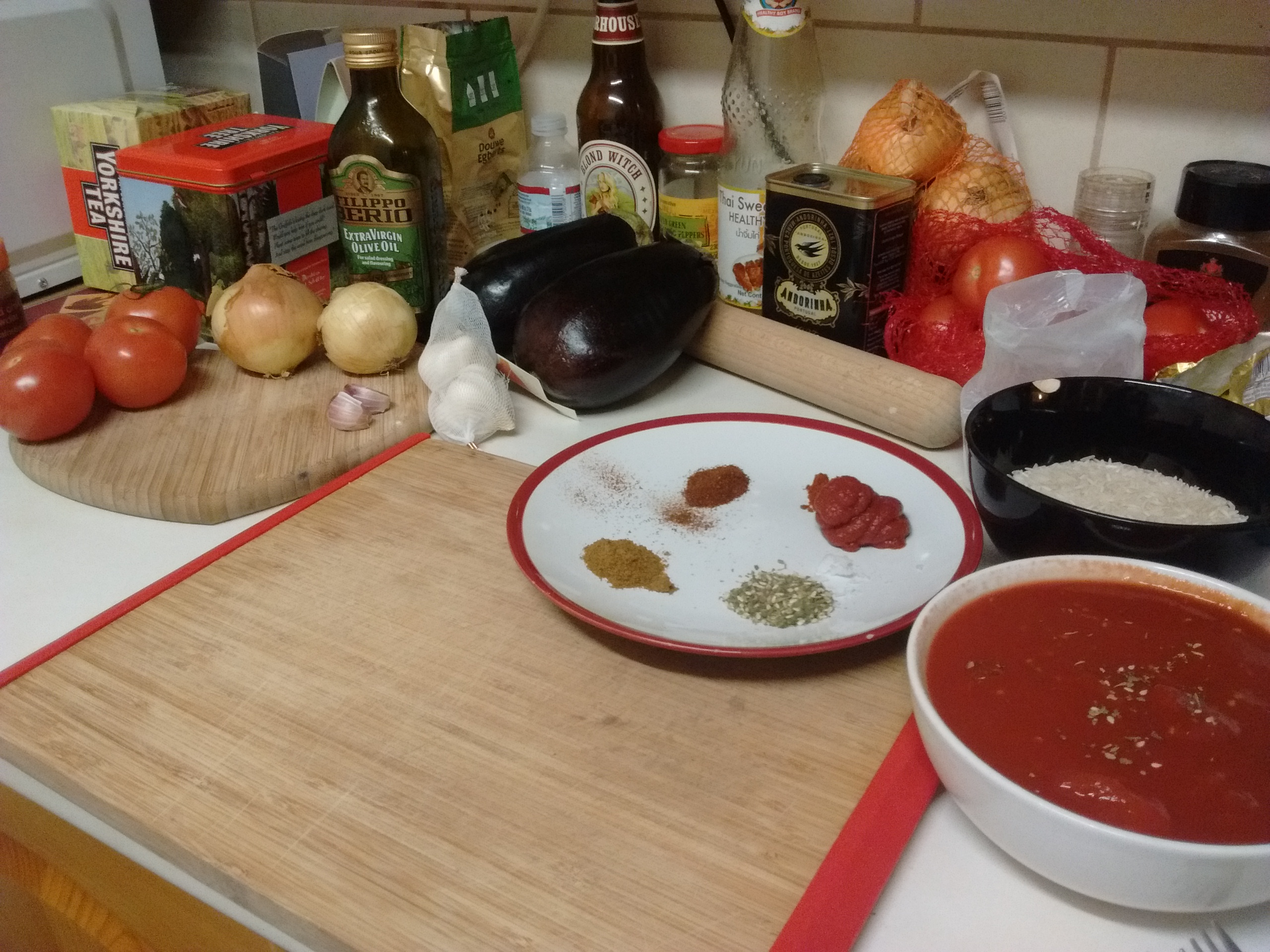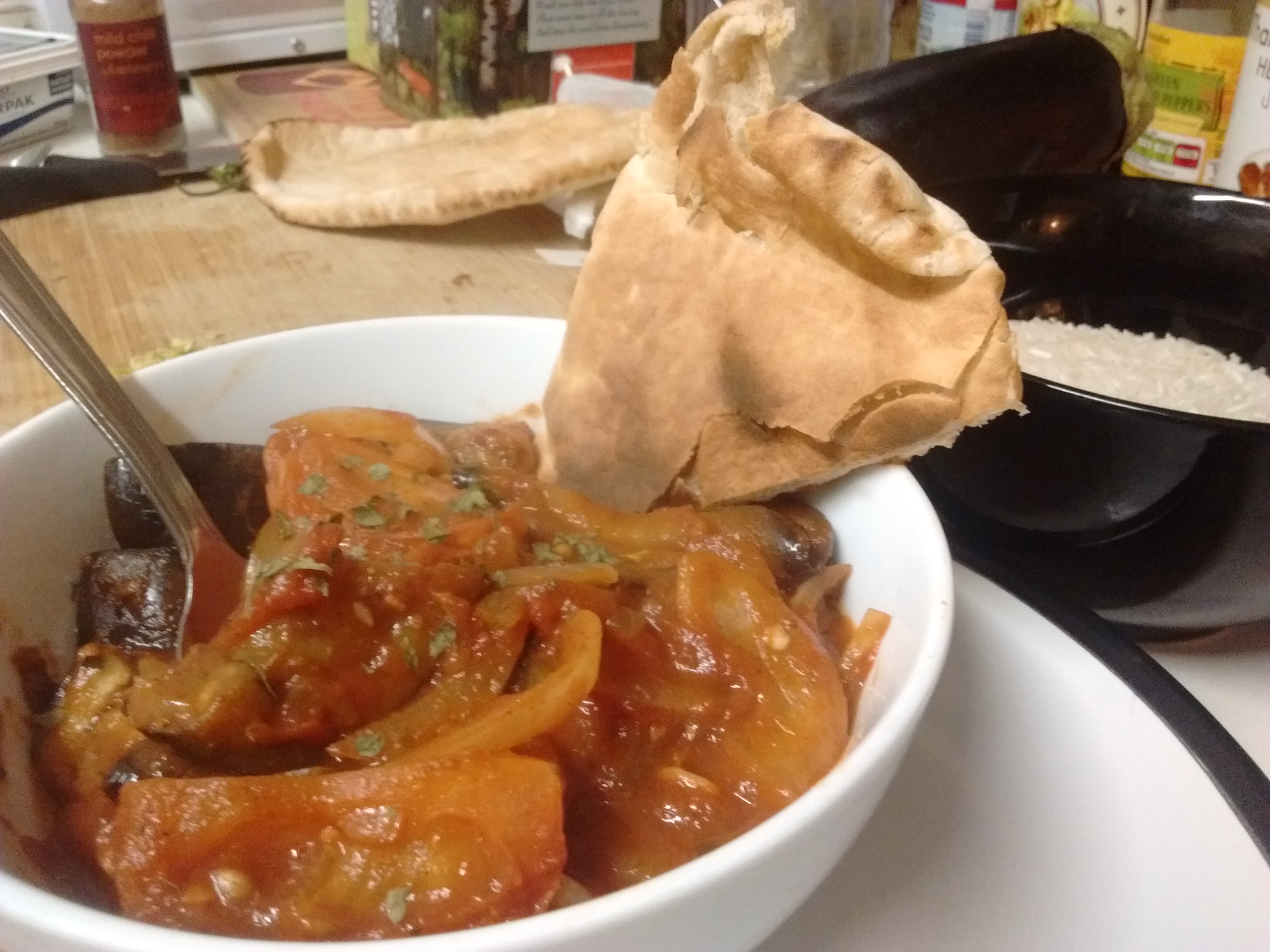 Keep working the paste in for a few more minutes until soft. Add the chopped fresh tomatoes and soften for about 1minute. Then add the aubegine and sliced onion and start to work in the sauce. Cook for a further 1-2 minutes. Then gradually add tomato sauce a spoon full at a time until your reach a soft, smooth and rich consistency. Salt and pepper to taste.