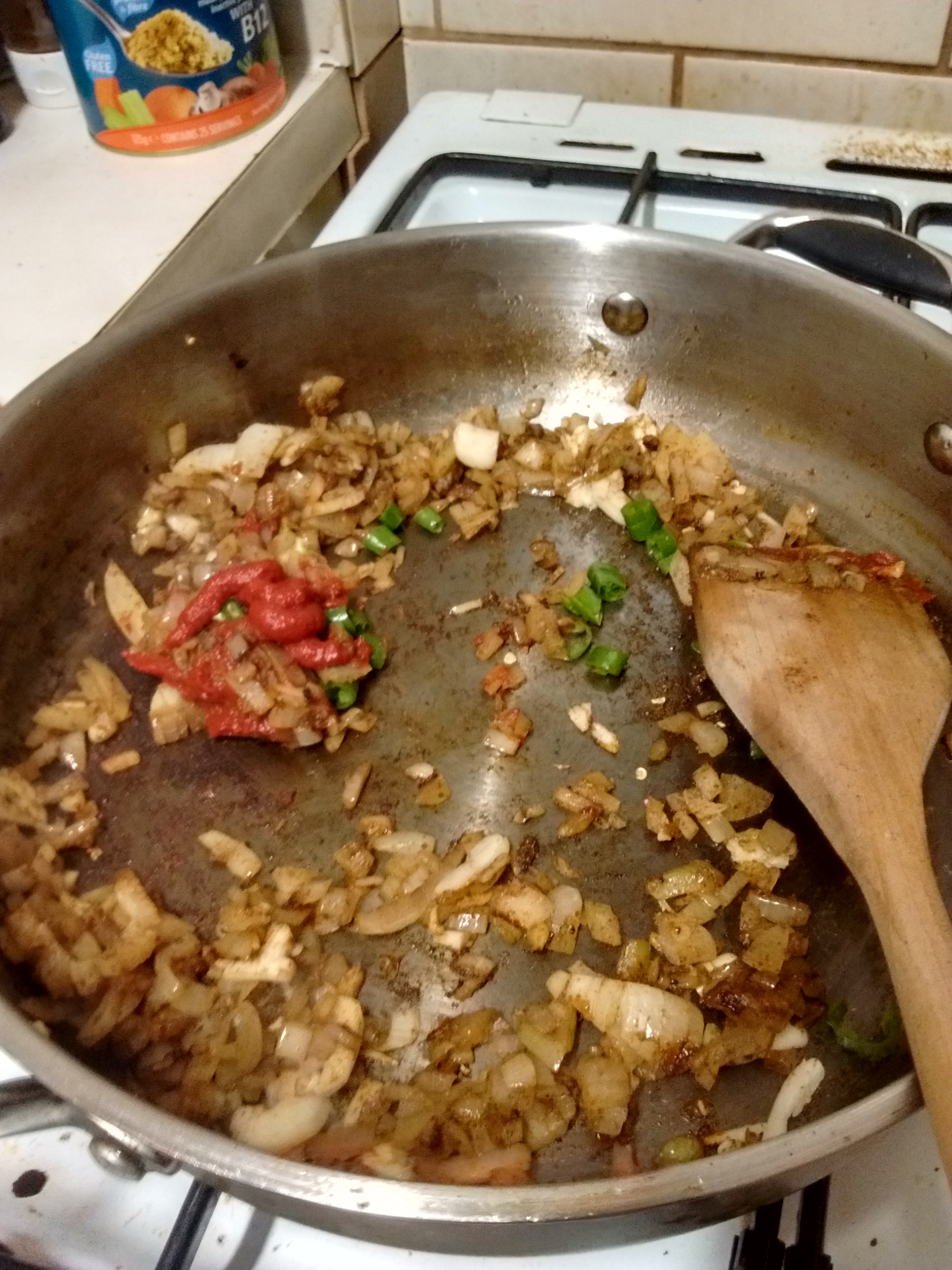 Add a little more oil and hot water if needed to soften the onions and garlic before then adding the green chillis, chilli powder and tomato paste. Start to integrate the ingredients together while gently ramping the heat up. If the paste starts to stick - that's ok! Just use a little water to lift it off the pan. The secret is in fact this will add some base notes of caramel which add depth to the dish.
