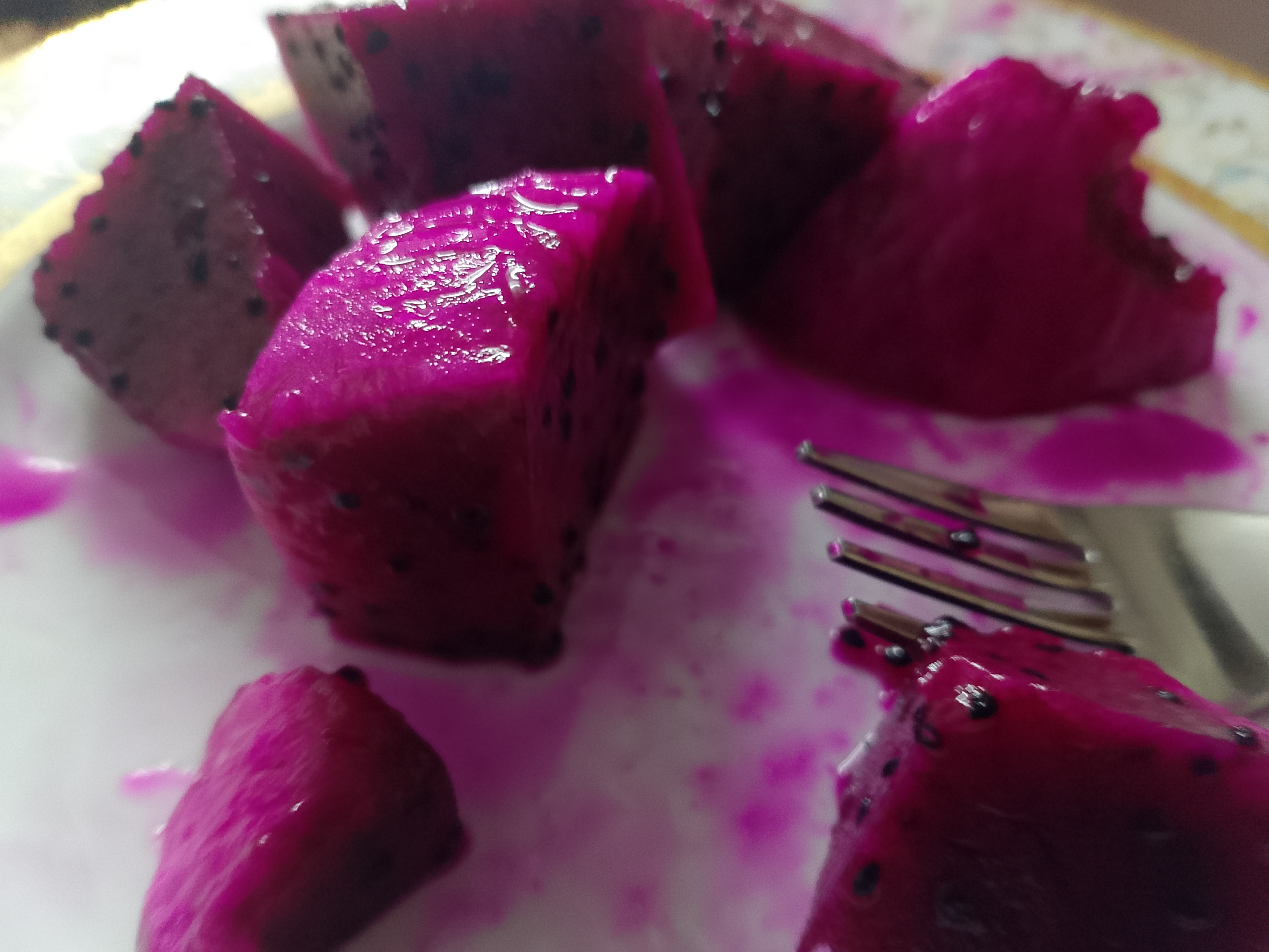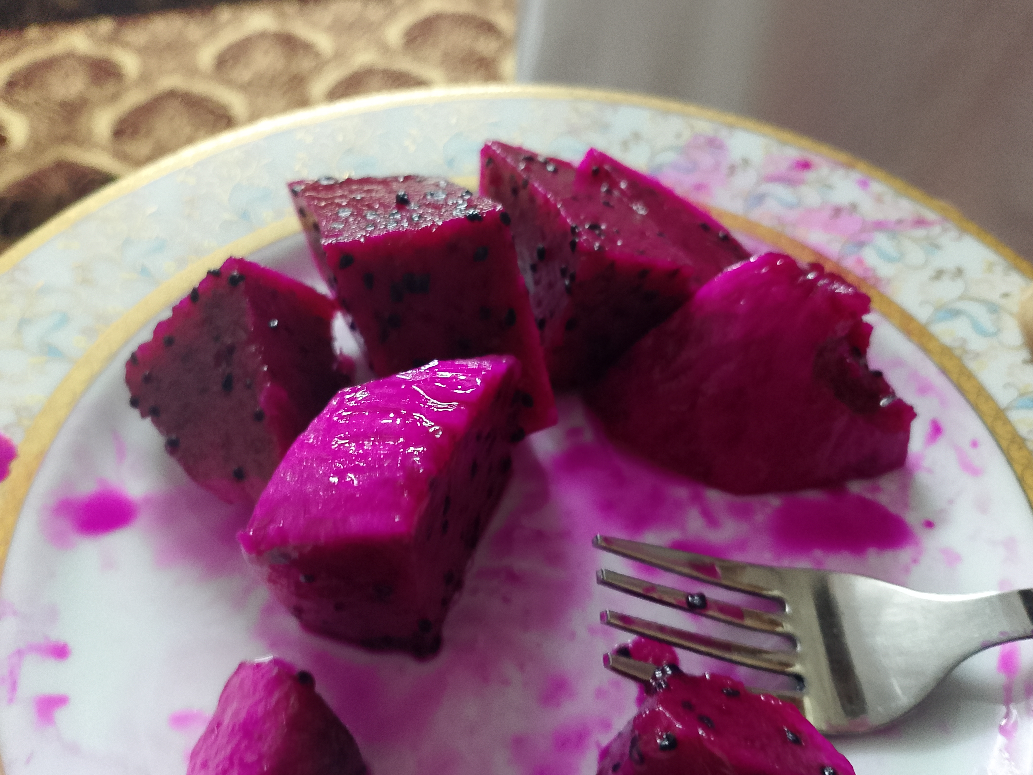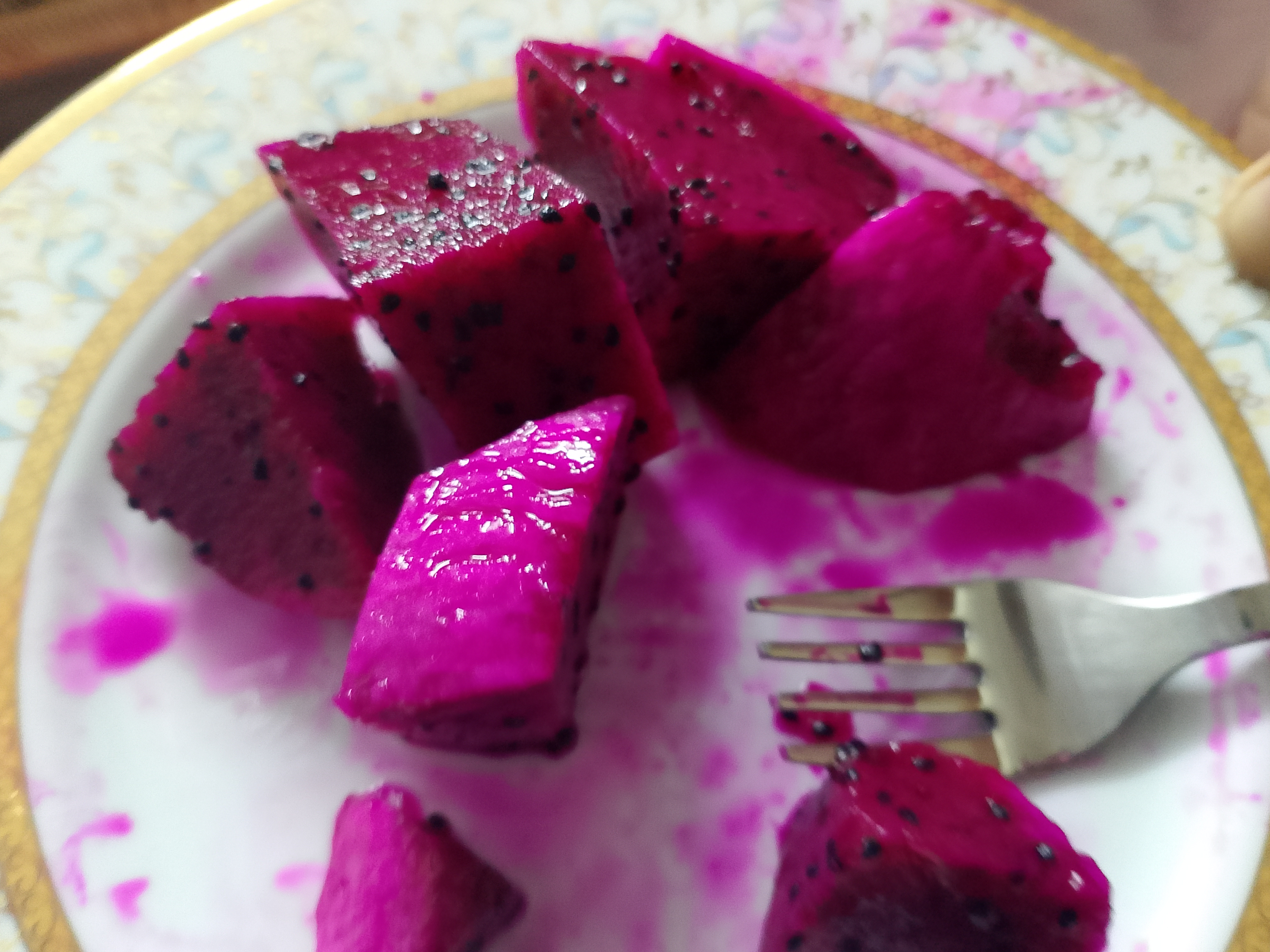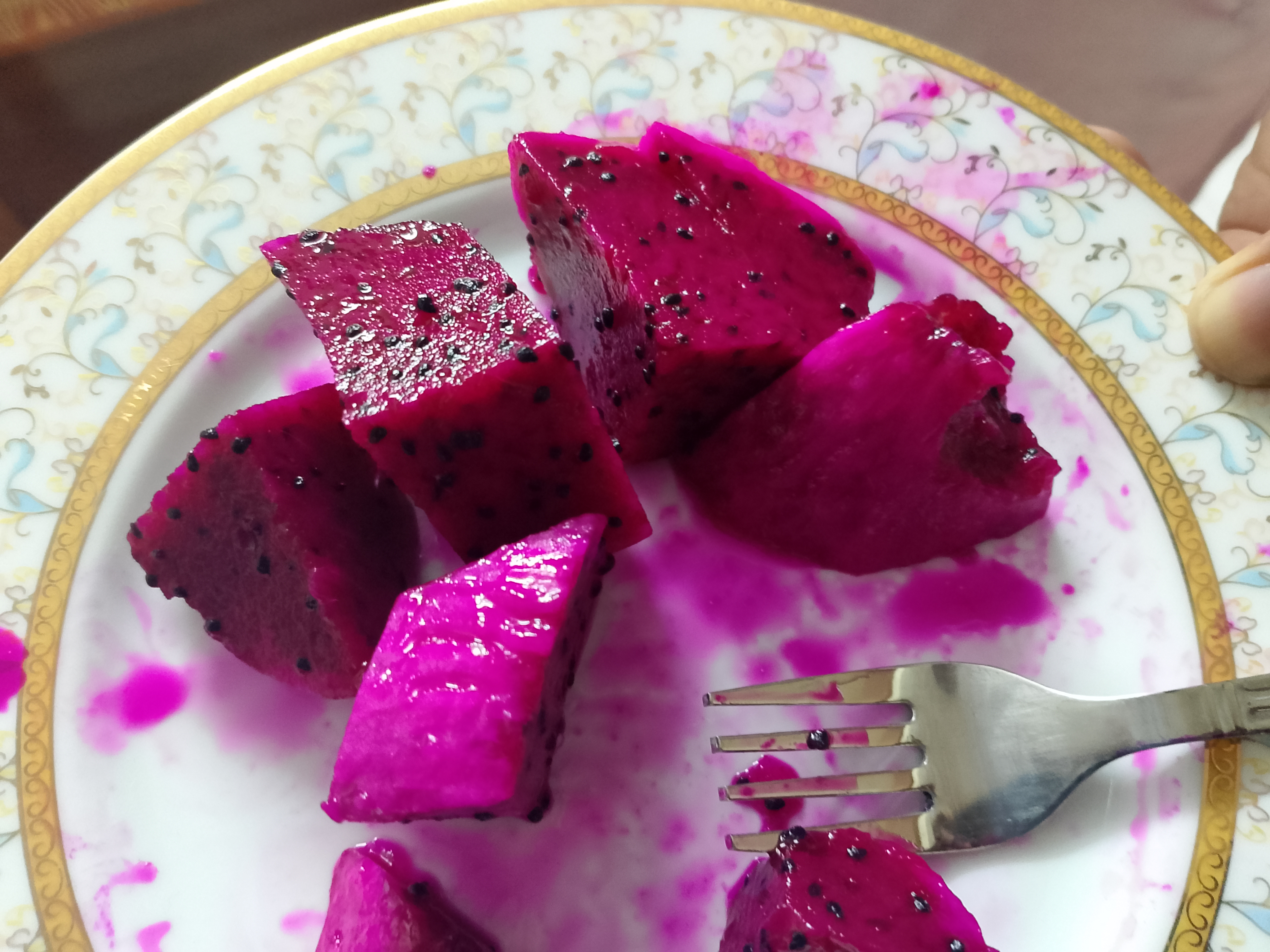 Dragon fruit is a tasty and delicious fruit. It looks quite different compared to other fruits, and its color is usually purple. The fruit tastes quite sweet, and inside it there are small black seeds that can be eaten. Sometimes it is a bit difficult to cut the fruit, which is why many people avoid cutting it, but it is very enjoyable and delicious to eat.