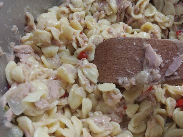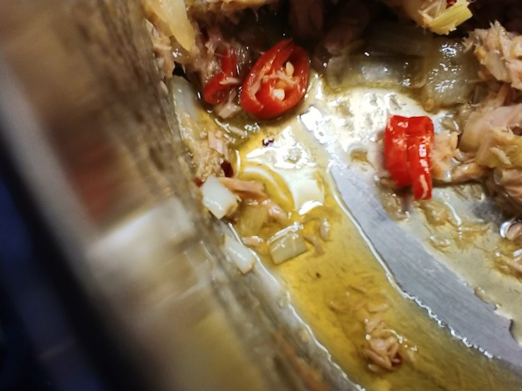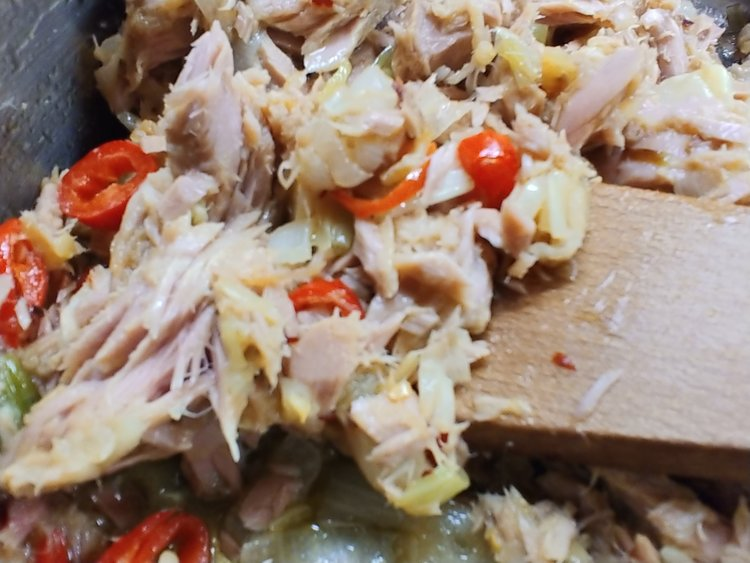 Add the chili and cook for another few minutes, then add the tuna. Turn the heat off and mix the tuna through the onion mix.