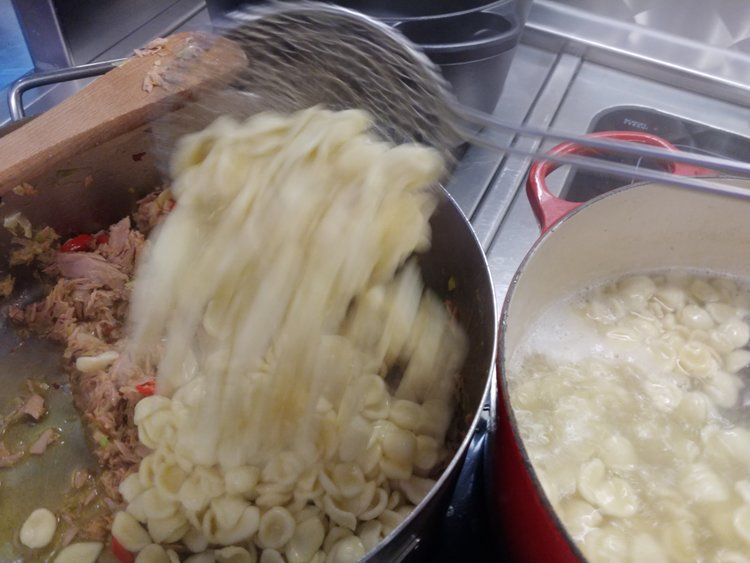 Use a slotted spoon or a "spider" and throw the pasta into the tuna mix. What we want to do here is add some of the pasta cooking water. The water will emulsify with the oil to form our sauce of sorts.