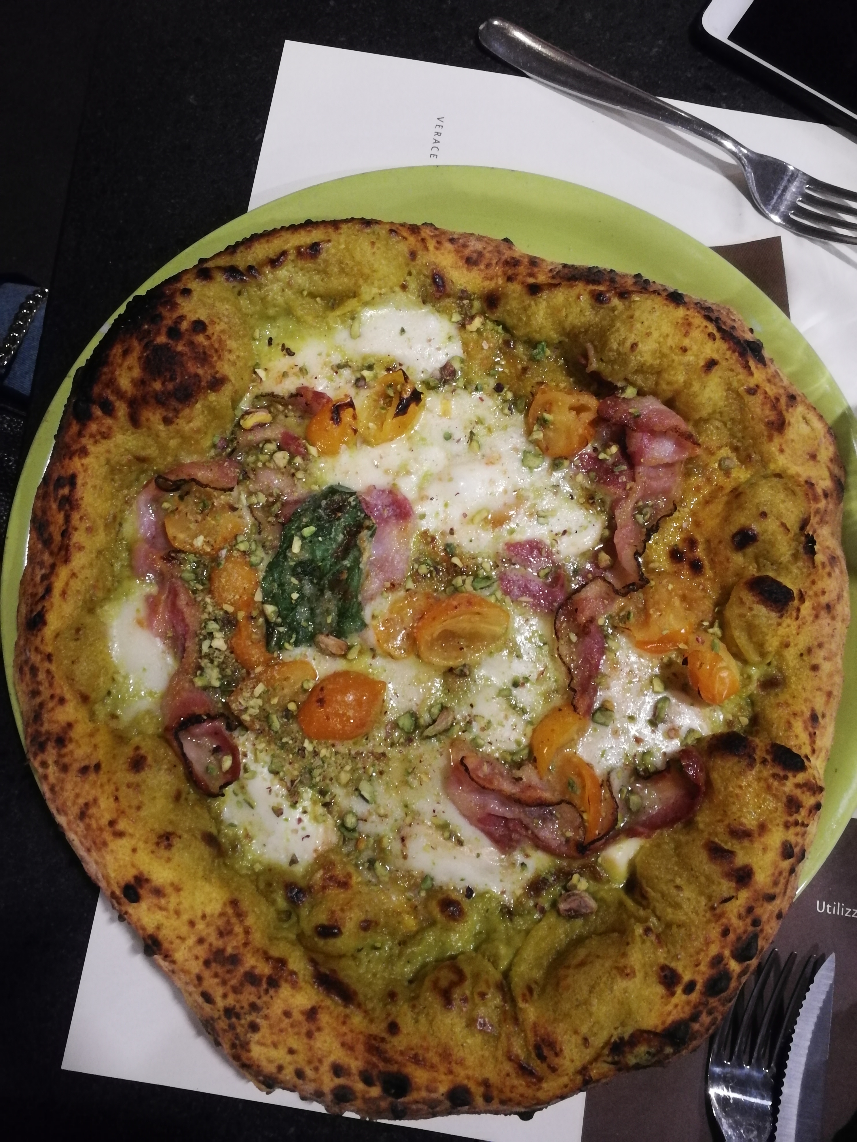 Questa è una pizza con impasto alla curcuma, crema di pistacchio, pomodorini gialli, provola di Agerola e pancetta.