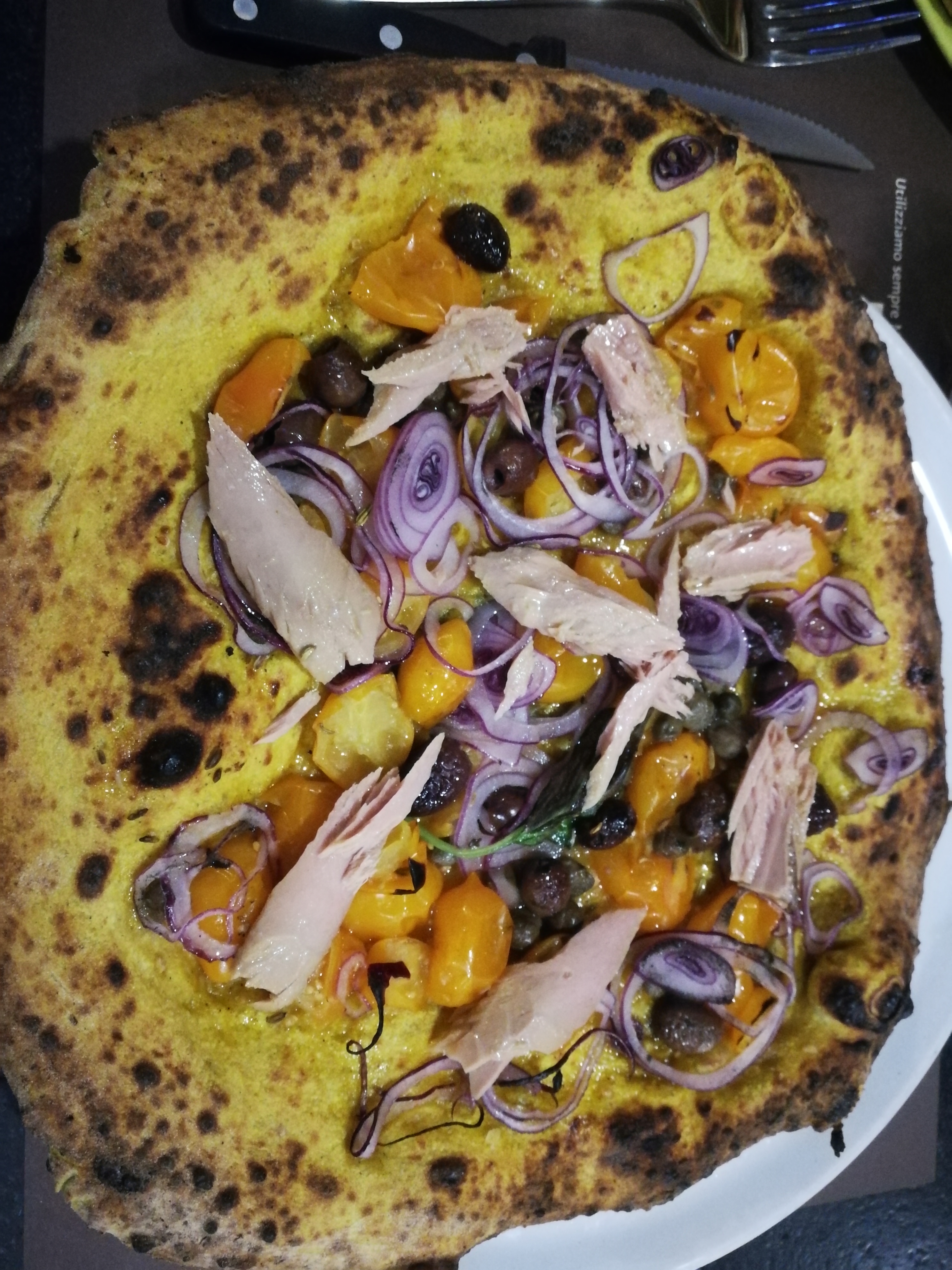 La seconda pizza invece sempre con impasto alla curcuma ma con tonno, cipolla rossa di tropea, pomodorini gialli e olive nere