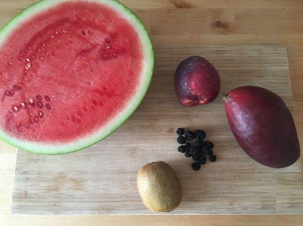 • Peel the fruits and chop them in the following way: the triangle shaped mango, the sliced kiwi, and the peach in irregular shapes.