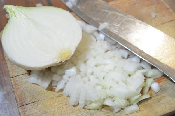 • Once chopped, the onion is fried until it is transparent and it is added in a container together with the tuna.