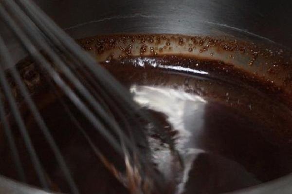 • We start by preparing the syrup, and for that we add the water in a pot and then we add the cocoa and sugar and stir it over medium heat until everything is dissolved. When it boils the fire is lowered and the vanilla is added. And let it cook for 5 more minutes until it thickens a bit.