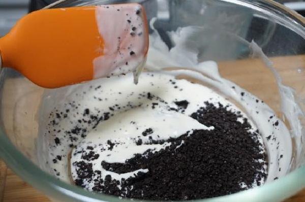• The 5 cookies are added to the cream of the ice cream, and mixed very gently until it is well incorporated.