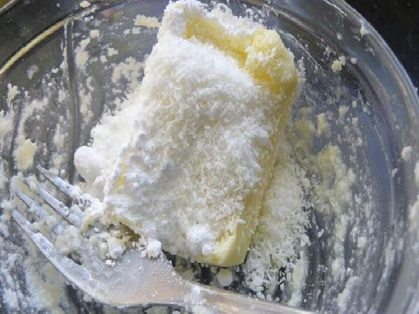 • While the ponquesitos are in the oven we take advantage of the coconut frosting, and for that we look for a container and we add the butter to room temperature, then we add the grated coconut and the sugar glass.