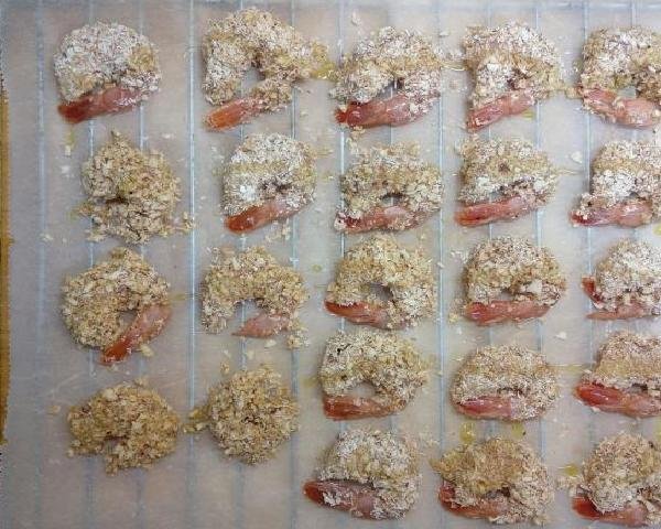 • In a separate container beat the egg and cornstarch. Then each shrimp is dipped in the egg and cornstarch mixture, then passed through the grated coconut. With the help of your hands you should try to make the coconut stick well. Later these crustaceans are placed on a tray with vegetable paper.