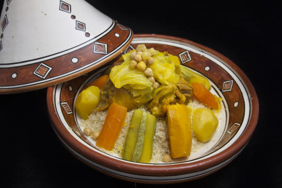 This process is repeated three times, until the couscous is mature. Then, grease with a little butter, pour into a round dish, hollow in the middle, place the pieces of meat, cover with vegetables and water in gravy. Serve hot.