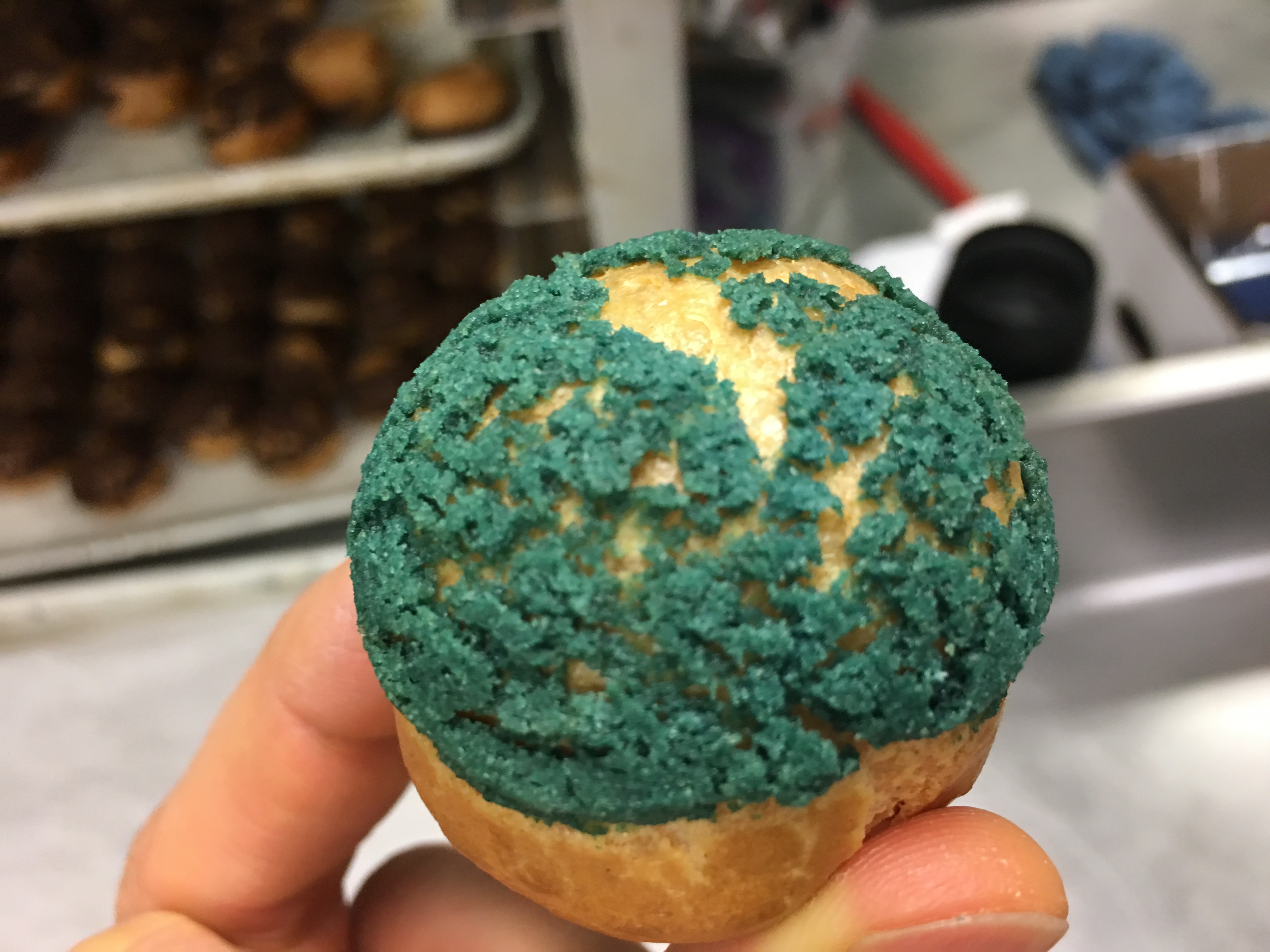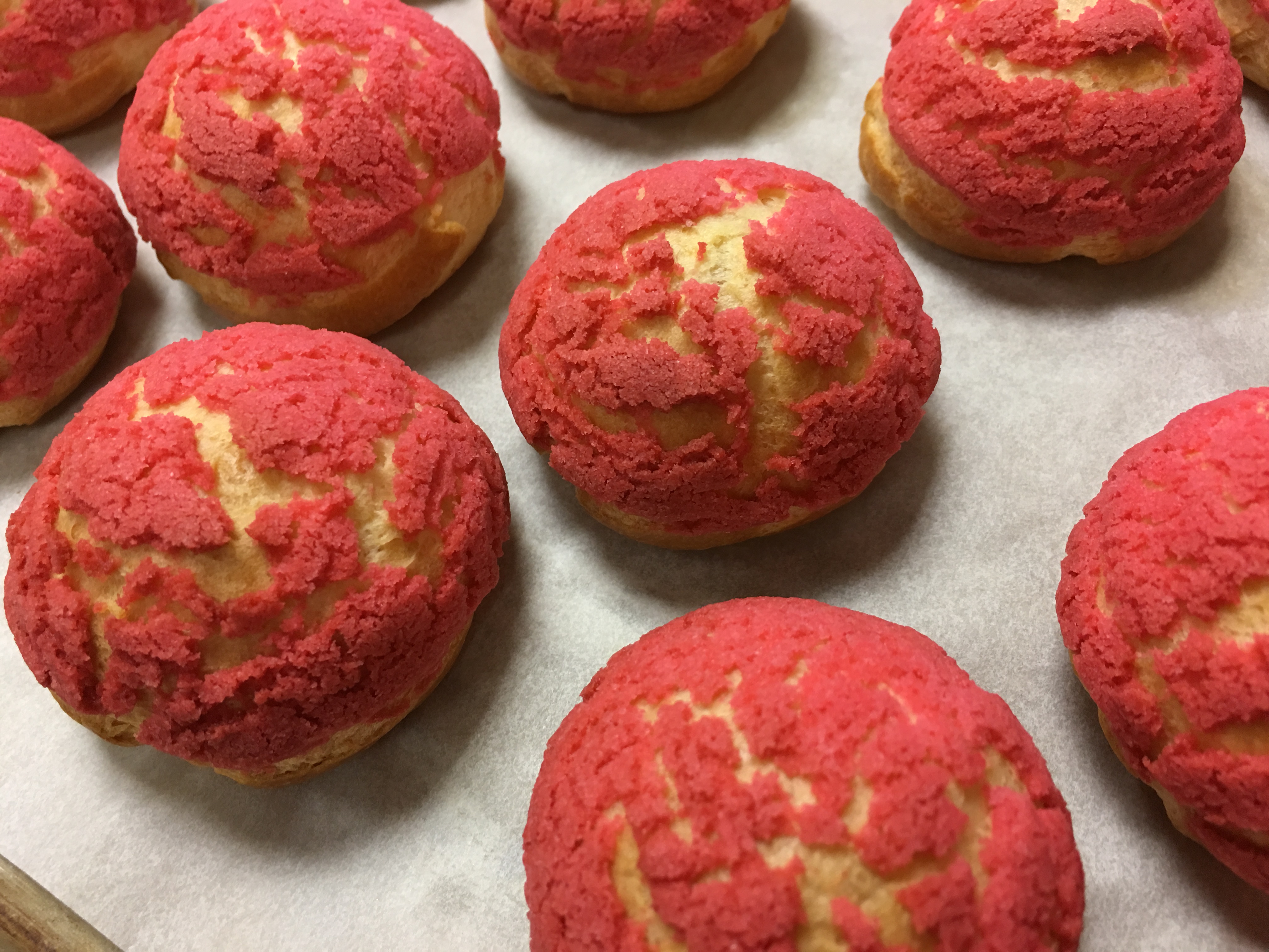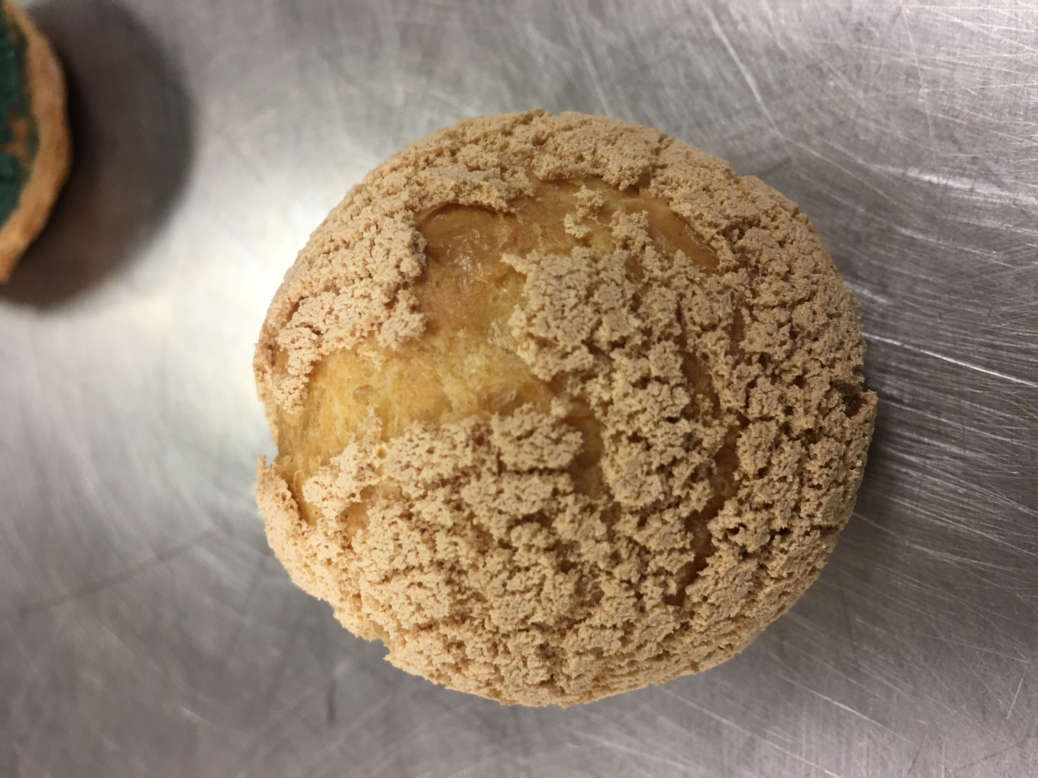 Cut small round and dispose it on top of your raw cream puff (pate a choux) and bake it.