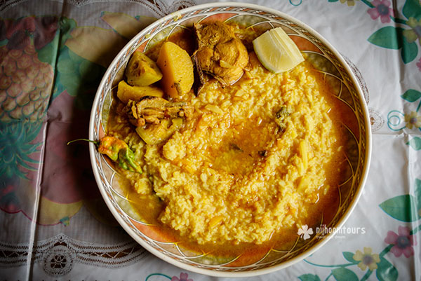 Morog Polao is a very traditional rich item in Bengali cuisine. It is cooked with spices, yogurt and clarified butter (ghee) and the chicken has a light and yummy taste. It is a treat for meat lovers, because chicken is used in large portions here.
